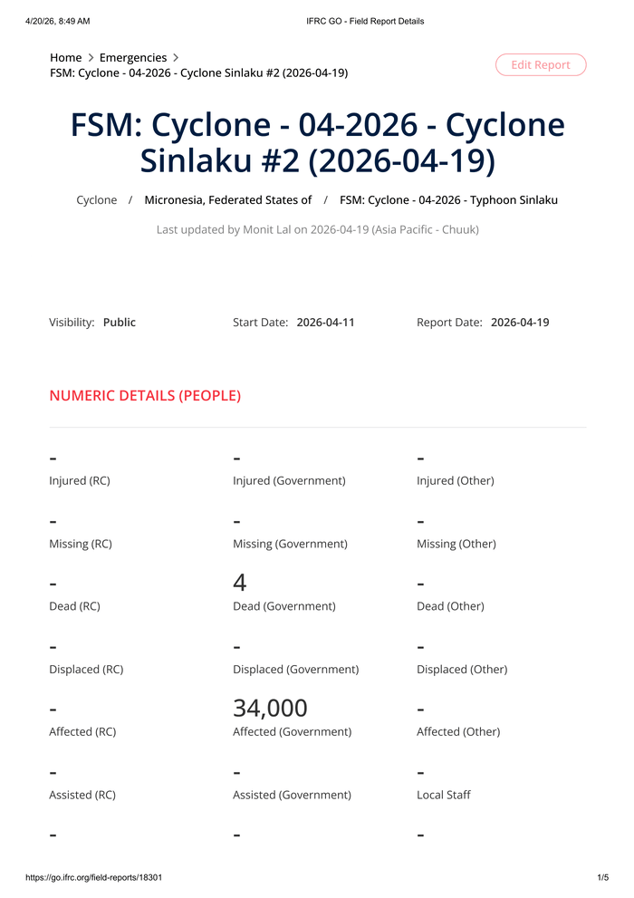 Country: Micronesia (Federated States of) Sources: International Federation of Red Cross and Red Crescent Societies, Micronesia Red Cross Society Please refer to the attached file. Description Typhoon Sinlaku was classified as a Category 5 storm when it affected the Federated States of Micronesia (FSM) and the Chuuk region. It intensified rapidly, reaching maximum sustained winds of 185 mph on 12 April 2026, and caused significant damage across the islands. Chuuk State is experiencing severe and widespread humanitarian impacts following the passage and stalling of Tropical Storm (Typhoon) Sinlaku, which remained near-stationary just offshore and subjected the islands to prolonged exposure to extreme winds, storm surge, and heavy rainfall. The intensity and slow movement of the system resulted in extensive destruction across both lagoon and outer islands, including Weno, Fananu, Piherarh, Tamatam, Onoun, Uman, and Parem. The hazard has caused significant damage to housing, infrastructure, and essential services. Many homes have been destroyed or severely damaged by strong winds and coastal flooding, with debris carried into residential areas. Critical infrastructure has been heavily affected, including power generation systems, water supply, communication networks, roads, and port facilities. Large portions of the population are experiencing prolonged power outages, with up to 75 per cent of distribution networks damaged in some areas and complete outages reported elsewhere. Communication systems, including telephone lines and emergency services, remain largely non-functional, significantly constraining coordination and response efforts. Access constraints continue to compound the situation. Roads across multiple islands remain blocked by debris, floodwaters, and fallen trees, limiting the movement of emergency services and delaying assessments. Damage to the main dock and underwater debris is restricting the ability of cargo vessels to offload critical supplies, further exacerbating shortages. Fuel infrastructure has also been compromised due to seawater contamination and electrical damage, raising concerns over the continuity of power supply, which is currently dependent on limited reserves. An estimated 34, 000 people have been affected across Chuuk State, with displacement reported and at least 100 individuals currently sheltering in evacuation centres. However, the full scale of impact remains unclear due to communication blackouts, particularly in remote outer islands. Initial reports confirm at least four fatalities, with the risk of additional casualties and injuries likely as information from isolated communities becomes available. The affected population is facing acute shortages of essential items, including safe drinking water, food, fuel, and basic household supplies. Damage to local businesses, including food storage and fuel distribution systems, has disrupted supply chains and reduced access to basic goods. There is increasing concern over public health risks, including the potential rise in communicable diseases due to limited access to clean water, sanitation, and healthcare services. The hospital is operating on emergency backup power, posing a critical risk to the continuity of life-saving services. In addition to material losses, the situation is contributing to rising community stress and reports of civil unrest linked to shortages of essential supplies. Many communities have lost not only their homes and assets but also access to basic services and livelihoods, particularly where food crops and local infrastructure have been destroyed. Immediate humanitarian needs include food assistance, safe water, emergency shelter, and support for debris clearance and early recovery. Overall, the situation remains critical, with compounded impacts from infrastructure damage, access constraints, and limited information from affected areas. Further assessments are urgently required to fully understand the scale of needs and to guide a coordinated humanitarian response. Request For Assistance Government Requests International Assistance Yes NS Requests International Assistance Yes Information Bulletin Published No Actions taken by RCRC General Other Summary American Red Cross have released Quick Action Fund or USD 25, 000 to MRCS to support with the response. American Red Cross NHQ in the US mainland is providing remote tech support to set up the comms link. Actions taken by Federation General Other Summary IFRC is supporting the MRCS, in the overall coordination of the response, including technical guidance and operational support to ongoing emergency activities. IFRC is working closely with MRCS to support the development and submission of a DREF request, ensuring that the application reflects priority needs and aligns with the evolving situation on the ground. Continuous coordination is being maintained between IFRC, MRCS, government authorities, and humanitarian partners to ensure complementarity of response efforts and avoid duplication. IFRC is supporting information management and situational reporting, contributing to the consolidation of data and analysis to inform decision-making and response prioritisation. Technical support is being provided to MRCS across key sectors, including relief, logistics, and planning, to strengthen the effectiveness and timeliness of the response. Actions taken by National Society General Water & Sanitation Evacuation Other Summary The MRCS is working closely with authorities and partners to assess needs and support affected communities through emergency response and relief efforts. MRCS has requested a DREF application. Joint operations with NDMO in Chuuk with the use of 6 drums of gasoline secured by MRCS from UNICEF. MRCS relief supplies are part of the inventory of the ship loading for Chuuk. MRCS will be distributing 200 Sawyer portable water filtration system to households donated by UNICEF (200 units) and the Pohnpei State Health Depart