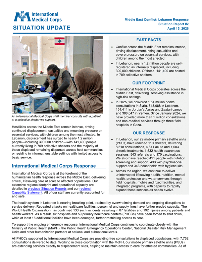Country: Lebanon Source: International Medical Corps Please refer to the attached file. FAST FACTS • Conflict across the Middle East remains intense, driving displacement, rising casualties and severe pressure on essential services, with children among the most affected. • In Lebanon, nearly 1. 2 million people are selfregistered as internally displaced, including 390, 000 children. Of these, 141, 400 are hosted in 709 collective shelters. OUR FOOTPRINT • International Medical Corps operates across the Middle East, delivering lifesaving assistance in high-risk settings. • In 2025, we delivered 1. 84 million health consultations in Syria, 543, 088 in Lebanon, 154, 411 in Jordan’s Azraq and Zaatari camps and 388, 647 in Yemen. Since January 2024, we have provided more than 1 million consultations and non-medical services through three field hospitals in Gaza. OUR RESPONSE • In Lebanon, our 29 mobile primary satellite units (PSUs) have reached 110 shelters, delivering 8, 518 consultations, 4, 611 acute and 1, 003 chronic treatments, 1, 532 health awareness sessions, 543 referrals and 170 vaccinations. We also have reached 491 people with nutrition screening and support, 438 with psychosocial support and 343 households with hygiene kits. • Across the region, we continue to deliver uninterrupted lifesaving health, nutrition, mental health, protection and water services through field hospitals, mobile and fixed facilities, and integrated programs, with capacity to rapidly expand these services as needs evolve.