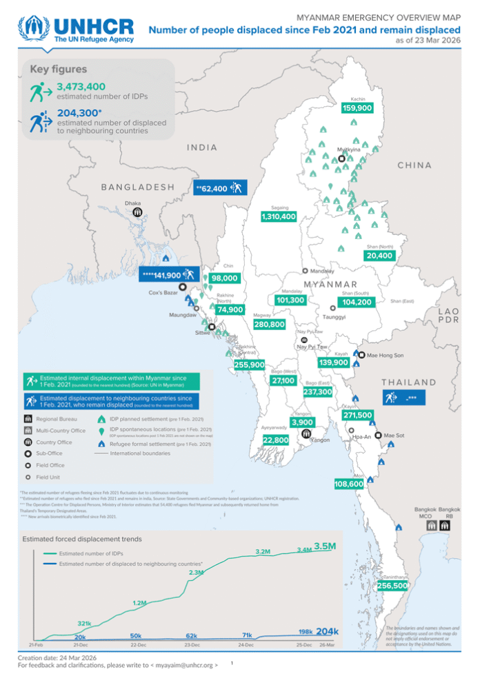 Myanmar Emergency Overview Map – Number of people displaced since Feb 2021 and remain displaced (as of 23 Mar 2026)