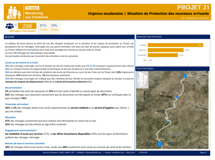 HomePoliticsP21 - Tchad | Dashboard Résultats Préliminaires Monitoring Urgence soudanaise (04 au... Politics P21 – Tchad | Dashboard Résultats Préliminaires Monitoring Urgence soudanaise (04 au 16 Avril 2026) By muhammadhasan0426@gmail.com April 19, 2026 0 3 Share FacebookTwitterPinterestWhatsApp Countries: Chad, Sudan Source: UN High Commissioner for Refugees Please refer to the attached Infographic. Read full story on Reliefweb Share FacebookTwitterPinterestWhatsApp Previous articleLalit Pandit Reveals Actual Version Of Salman Khan’s ‘O O Jaane Jaana’ Never Made It To The MovieNext articleHere’s How Using More Recycled Plastic Could Ease The Pain Of Oil Shocks RELATED ARTICLES Politics PM Modi To Hold Bilateral Summit With South Korean Prez Lee, Discuss Supply Chain Cooperation April 19, 2026 Politics TN Polls: Campaigning Ends Tomorrow, 4023 Candidates In Fray April 19, 2026 Politics Two More Held In Noida Workers’ Protest Case April 19, 2026 LEAVE A REPLY Cancel reply Comment: Please enter your comment! Name:* Please enter your name here Email:* You have entered an incorrect email address! Please enter your email address here Website: Save my name, email, and website in this browser for the next time I comment. - Advertisment - Most Popular امریکا سے مذاکرات جاری ہیں لیکن جنگ کیلئے بھی تیار ہیں، ایران کا دو ٹوک اعلان April 20, 2026 South Korean President Lee Jae Myung Accorded Ceremonial Welcome At Rashtrapati Bhavan April 20, 2026 Star Awards 2026 fashion highlights: Daring looks, statement neckties and black ensembles April 20, 2026 Indonesia to stop diesel imports, shift to palm oil fuel April 20, 2026 Load more Recent Comments