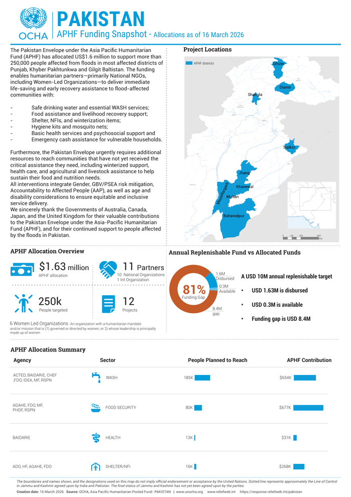 HomePoliticsPakistan APHF Funding Snapshot (Allocations as of 16 March 2026) Politics Pakistan APHF Funding Snapshot (Allocations as of 16 March 2026) By muhammadhasan0426@gmail.com April 27, 2026 0 2 Share FacebookTwitterPinterestWhatsApp Country: Pakistan Source: UN Office for the Coordination of Humanitarian Affairs Please refer to the attached Infographic. Read full story on Reliefweb Share FacebookTwitterPinterestWhatsApp Previous articleReport Warns AI in Healthcare Could Put Patients at RiskNext articleپاکستان کے فیلڈ مارشل اور وزیراعظم بہت اچھے اور قابل احترام ہیں: امریکی صدر RELATED ARTICLES Politics محسن نقوی کا بڑا ایکشن: اسلام آباد میں ایف سی کیمپ آفس مسمار، تجاوزات کے خلاف ’بلا امتیاز‘ آپریشن کا آغاز April 27, 2026 Politics انگور اڈہ زلول خیل میں افغان اشتعال انگیزی، پاک فوج کی بروقت کارروائی، پوسٹیں تباہ April 27, 2026 Politics Kim Jong Un opens memorial for N Korean soldiers killed in Ukraine war April 27, 2026 LEAVE A REPLY Cancel reply Comment: Please enter your comment! Name:* Please enter your name here Email:* You have entered an incorrect email address! Please enter your email address here Website: Save my name, email, and website in this browser for the next time I comment. - Advertisment - Most Popular WHO Botswana Q1 Newsletter 2026 April 27, 2026 میرپورخاص: خودکشی کرنے والی میڈیکل طالبہ ہراسانی کے سبب شدید ذہنی دباؤ کا شکار تھی، رپورٹ April 27, 2026 Balochistan health card program provides free quality treatment to 345,000 patients April 27, 2026 Dengue team reviews performance, deployment April 27, 2026 Load more Recent Comments