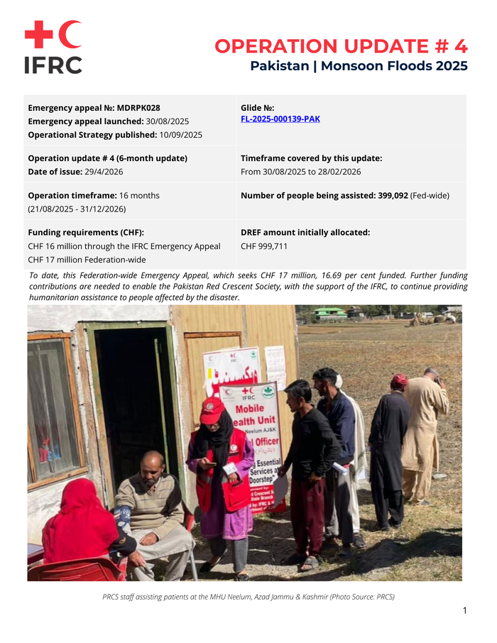 Country: Pakistan Source: International Federation of Red Cross and Red Crescent Societies Please refer to the attached file. A. SITUATION ANALYSIS Description of the crisis The 2025 monsoon season, which began in late June and intensified between August and September, brought exceptionally heavy rainfall across Pakistan, triggering widespread flash floods, riverine inundation, and localized Glacial Lake Outburst Floods (GLOFs). The disaster affected all major provinces, with Khyber Pakhtunkhwa (KP) and Punjab emerging as the worst-hit regions. 1 Secondary impacts—including waterlogging, infrastructure damage, and disruption of essential services—persisted into late 2025, although receding floodwaters and improved weather conditions enabled a gradual transition from emergency response to early recovery. Between September and November 2025, approximately 1, 037 fatalities and over 1, 060 injuries were reported nationwide, according to the National Disaster Management Authority (NDMA) and partner agencies. 2 Children were disproportionately affected, with hundreds of child deaths reported. 3 At the peak of the crisis, millions of people were affected and displaced. Estimates indicate that over 2. 5 million people were temporarily displaced, and more than 3 million people evacuated or rescued through large-scale operations. 4 By late 2025, displacement levels had significantly decreased as floodwaters receded and affected populations began returning to their areas of origin. Punjab experienced some of the most severe flooding in decades, particularly along the Sutlej, Ravi, and Chenab river systems. Reports indicate that approximately 4 to 4. 5 million people were affected in Punjab alone, with widespread inundation of settlements and agricultural land. 5 Nationwide, the floods caused extensive infrastructure damage, including thousands of houses damaged or destroyed, hundreds of kilometres of roads and dozens of bridges washed away. Electricity, communication, and transport networks were also significantly disrupted. 6 In KP, intense rainfall and cloudbursts—particularly in districts such as Buner—triggered deadly flash floods and landslides, leading to high mortality and isolation of mountainous communities. 7 The floods severely impacted Pakistan’s agrarian economy, with over 2. 2 million hectares of agricultural land inundated nationwide, affecting staple and cash crops such as rice, cotton, maize, and sugarcane. Livestock losses and destruction of farming assets further weakened rural livelihoods. 8 Punjab, as the country’s primary agricultural hub, faced significant crop losses during the Kharif harvest season, contributing to rising food prices and economic strain. Despite this, the transition to the Rabi planting season (2025–26) has supported early recovery, with improved water availability in reservoirs aiding wheat cultivation. Flooding and stagnant water significantly increased public health risks. Additionally, overcrowded camps and contaminated water sources contributed to outbreaks of waterborne diseases (e. g. , cholera, diarrhea) and vectorborne diseases (e. g. , dengue, malaria). 9 Damage to water and sanitation infrastructure exacerbated risks, particularly for children and vulnerable populations. Millions of people remained at risk due to limited access to safe drinking water, sanitation, and healthcare services. Vulnerable groups, including women, children (over 500 child deaths reported nationwide), older persons, migrants (including Afghan refugees), and Persons with Disabilities (PWDs), face ongoing risk from mobility barriers, aid exclusion and inadequate shelters, particularly in northern areas, where communities are bracing for one of the coldest winters in decades under La Niña conditions. Undocumented migrants and 1. 5 million malnourished children remain highly susceptible to contaminated water. Approximately 30 per cent of Water, Sanitation and Hygiene (WASH) systems remain compromised (down from 50 per cent), fueling surges in waterborne diseases like diarrhea and vector-borne illnesses such as dengue and malaria. The Government of Pakistan, led by NDMA and Provincial Disaster Management Authorities (PDMAs), mounted largescale rescue and relief efforts. Over 3 million people were rescued or evacuated, placed in thousands of relief camps established at the peak of displacement. Assistance included the provision of food, shelter, and essential Non-Food Items (NFIs). Humanitarian partners, including the Pakistan Red Crescent Society (PRCS), the IFRC, United Nations (UN) agencies, and Non-Governmental Organizations (NGOs), provided multi-sectoral assistance covering health services and mobile medical units, WASH support, cash for immediate needs, food assistance and emergency shelter. By late 2025, the response had transitioned toward early recovery, focusing on shelter reconstruction, livelihood restoration, agricultural recovery, strengthening resilience and disaster preparedness. While immediate life-saving needs have declined, recovery remains uneven and fragile. Key priorities include strengthening access to health facilities and services, restoration of agricultural livelihoods, strengthening of WASH systems to prevent disease outbreaks and preparedness towards climate-resilient interventions, including flood management and early warning systems. The 2025 floods once again underscore Pakistan’s continued high vulnerability to climate-induced disasters, with increasing frequency and intensity of monsoon events linked to climate change.