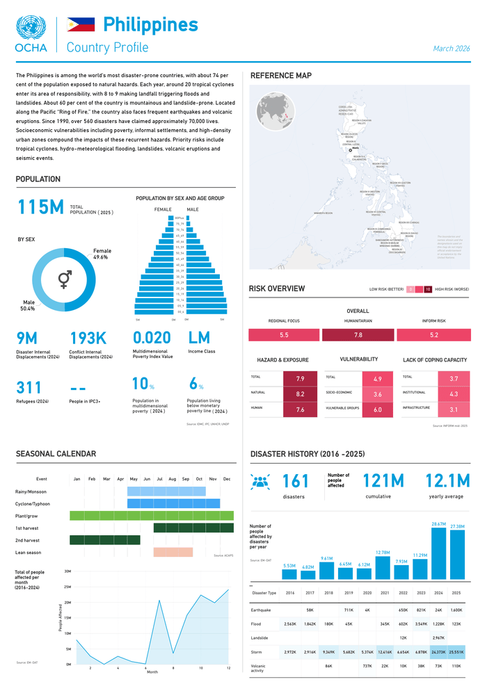 Country: Philippines Source: UN Office for the Coordination of Humanitarian Affairs Please refer to the attached Infographic. The Philippines is among the world’s most disaster-prone countries, with about 74 per cent of the population exposed to natural hazards. Each year, around 20 tropical cyclones enter its area of responsibility, with 8 to 9 making landfall triggering floods and landslides. About 60 per cent of the country is mountainous and landslide-prone. Located along the Pacific “Ring of Fire, ” the country also faces frequent earthquakes and volcanic eruptions. Since 1990, over 560 disasters have claimed approximately 70, 000 lives. Socioeconomic vulnerabilities including poverty, informal settlements, and high-density urban zones compound the impacts of these recurrent hazards. Priority risks include tropical cyclones, hydro-meteorological flooding, landslides, volcanic eruptions and seismic events