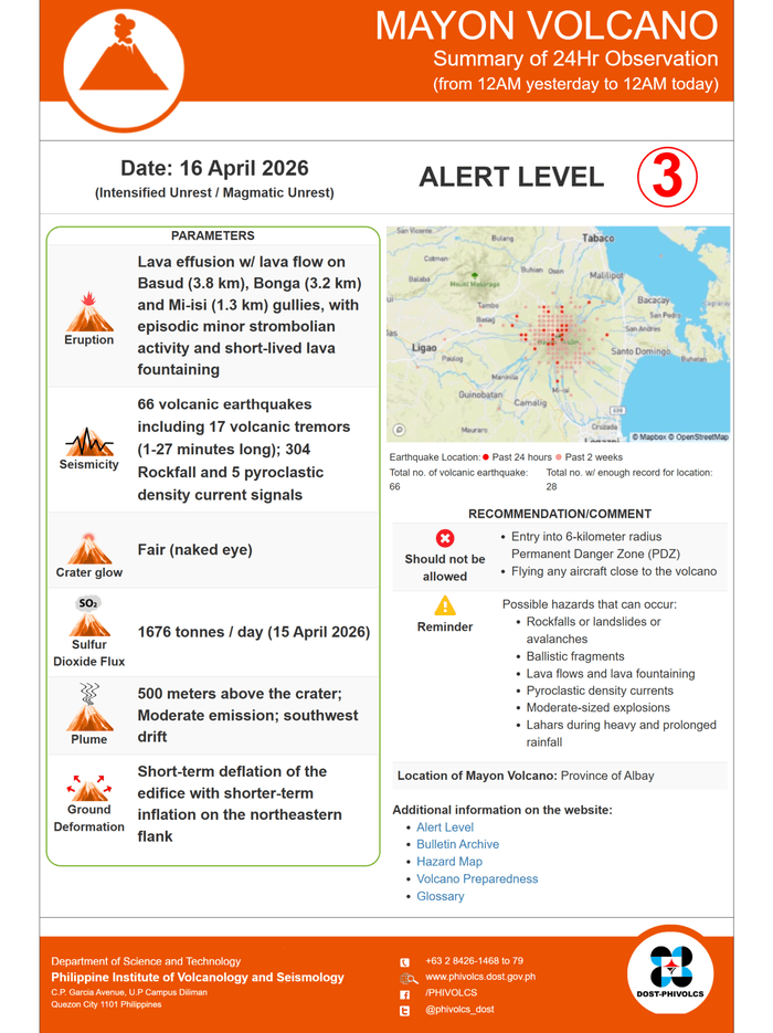 Philippines: Mayon Volcano Summary of 24Hr Observation 16 April 2026 12:00 AM [EN/TL]