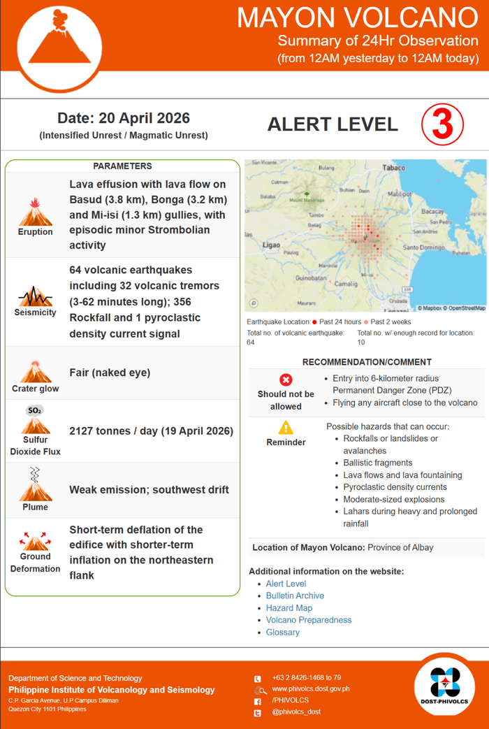 Philippines: Mayon Volcano Summary of 24Hr Observation 20 April 2026 12:00 AM [EN/TL]