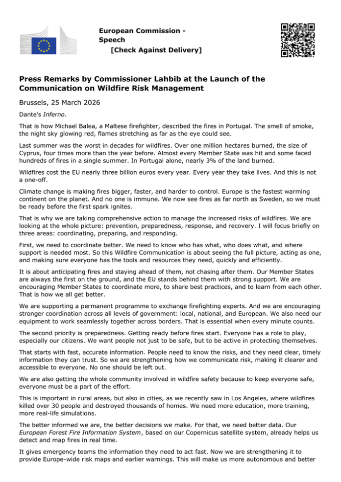 Countries: Portugal, Cyprus, Romania, Sweden Source: European Commission Please refer to the attached file. “Check against delivery” Dante’s Inferno. That is how Michael Balea, a Maltese firefighter, described the fires in Portugal. The smell of smoke, the night sky glowing red, flames stretching as far as the eye could see. Last summer was the worst in decades for wildfires. Over one million hectares burned, the size of Cyprus, four times more than the year before. Almost every Member State was hit and some faced hundreds of fires in a single summer. In Portugal alone, nearly 3% of the land burned. Wildfires cost the EU nearly three billion euros every year. Every year they take lives. And this is not a one-off. Climate change is making fires bigger, faster, and harder to control. Europe is the fastest warming continent on the planet. And no one is immune. We now see fires as far north as Sweden, so we must be ready before the first spark ignites. That is why we are taking comprehensive action to manage the increased risks of wildfires. We are looking at the whole picture: prevention, preparedness, response, and recovery. I will focus briefly on three areas: coordinating, preparing, and responding. First, we need to coordinate better. We need to know who has what, who does what, and where support is needed most. So this Wildfire Communication is about seeing the full picture, acting as one, and making sure everyone has the tools and resources they need, quickly and efficiently. It is about anticipating fires and staying ahead of them, not chasing after them. Our Member States are always the first on the ground, and the EU stands behind them with strong support. We are encouraging Member States to coordinate more, to share best practices, and to learn from each other. That is how we all get better. We are supporting a permanent programme to exchange firefighting experts. And we are encouraging stronger coordination across all levels of government: local, national, and European. We also need our equipment to work seamlessly together across borders. That is essential when every minute counts. The second priority is preparedness. Getting ready before fires start. Everyone has a role to play, especially our citizens. We want people not just to be safe, but to be active in protecting themselves. That starts with fast, accurate information. People need to know the risks, and they need clear, timely information they can trust. So we are strengtheninghow we communicaterisk, making it clearer and accessible to everyone. No one should be left out. We are also getting the whole community involved in wildfire safety because to keep everyone safe, everyone must be a part of the effort. This is important in rural areas, but also in cities, as we recently saw in Los Angeles, where wildfires killed over 30 people and destroyed thousands of homes. We need more education, more training, more real-life simulations. The better informed we are, the better decisions we make. For that, we need better data. Our European Forest Fire Information System, based on our Copernicus satellite system, already helps us detect and map fires in real time. It gives emergency teams the information they need to act fast. Now we are strengthening it to provide Europe-wide risk maps and earlier warnings. This will make us more autonomous and better connected with our international partners. We are also using the power of Artificial Intelligence. Just like AI helps doctors improve treatments and farmers protect crops, it can help us fight wildfires. It can predict and simulate how fires will spread, guide firefighters on the ground, and help us take the right decisions and act earlier. This will save lives. The third area of focus is response. We need to respond faster and more effectively and that starts with stronger firefighting capacity. We are adding twelve firefighting planes and five helicopters to our rescEU fleet. The first one is already in Romania. We are also opening a new firefighting hub in Cyprus. It will train firefighters, run joint drills, and get teams ready for the fire season, together with our partners from across the region. We will also preposition more firefighters in high-risk areas, so they are ready before fires spread. I saw this myself in Greece. Czech firefighters working side by side with Greek teams, helping in a crisis while keeping their skills sharp. Good for Greece, good for the Czech Republic, and an excellent example of European solidarity. Allow me to end by taking a step back. Tomorrow marks one year since we launched our Preparedness Strategy. The threats we face are complex and fast-moving, and they are all connected. In Europe, we have a clear choice: cross our fingers and hope for the best. Or we can face reality and prepare. We have chosen to prepare. This Wildfire Communication is an important part of that effort, to keep people safe, and to keep our societies strong.