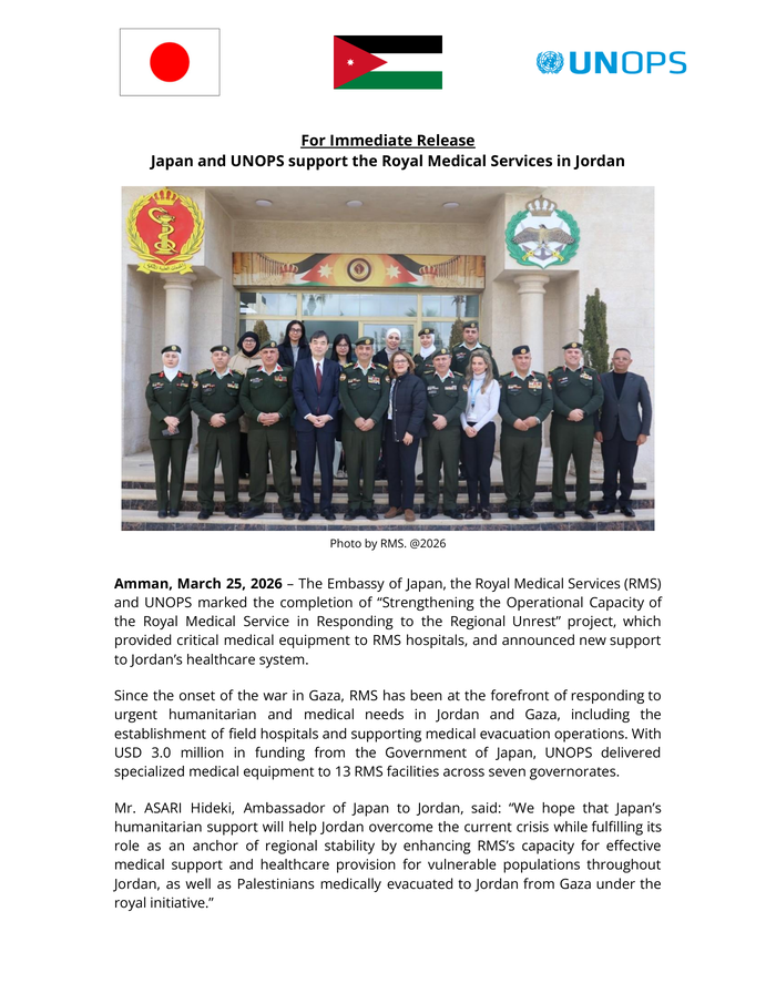 Countries: Jordan, Japan, occupied Palestinian territory Source: UNOPS Please refer to the attached files. For Immediate Release Japan and UNOPS support the Royal Medical Services in Jordan Amman, March 25, 2026 – The Embassy of Japan, the Royal Medical Services (RMS) and UNOPS marked the completion of “Strengthening the Operational Capacity of the Royal Medical Service in Responding to the Regional Unrest” project, which provided critical medical equipment to RMS hospitals, and announced new support to Jordan’s healthcare system. Since the onset of the war in Gaza, RMS has been at the forefront of responding to urgent humanitarian and medical needs in Jordan and Gaza, including the establishment of field hospitals and supporting medical evacuation operations. With USD 3. 0 million in funding from the Government of Japan, UNOPS delivered specialized medical equipment to 13 RMS facilities across seven governorates. Mr. ASARI Hideki, Ambassador of Japan to Jordan, said: “We hope that Japan’s humanitarian support will help Jordan overcome the current crisis while fulfilling its role as an anchor of regional stability by enhancing RMS’s capacity for effective medical support and healthcare provision for vulnerable populations throughout Jordan, as well as Palestinians medically evacuated to Jordan from Gaza under the royal initiative. ” Dr. Sahal Al-Hamouri, Director General of the Royal Medical Services, said: “This grant from the government of Japan embodies the depth of international partnership and cooperation in supporting Jordan’s medical sector, and contributes significantly to strengthening the work of Royal Medical Services’ hospitals and improving the quality and efficiency of the health care provided, ” he said, emphasizing Royal Medical Services’ continued commitment to its national and humanitarian mission of providing comprehensive and distinguished health care. “I am honored to witness yet another successful milestone in our long-standing partnership with the Government of Japan, supporting the Royal Medical Services in Jordan. The official handover of this new, essential equipment is instrumental in enhancing access to healthcare services, especially for vulnerable populations. Our sustained commitment and collaboration are crucial for ultimately strengthening Jordan’s overall resilience and its health sector capacity in particular for the benefit of all. ” said Muhammad Usman Akram, Representative and Director of UNOPS Multi-Country Office in Amman. Following the successful completion of this project, the Government of Japan and UNOPS announced a launch of a new project to further enhance the operational capacity of the RMS, recognizing its critical role in the continued delivery of life-saving care, including under the “Jordanian Medical Corridor” announced in March 2025. The newly announced support will further strengthen RMS service delivery capacity and help expand access to critical health services for vulnerable populations. The projects contribute to SDG 3: Good Health and Well-being. END – About UNOPS: UNOPS offers practical solutions to the UN and other partners, across peace and security, humanitarian and development operations. UNOPS mission is to help people build better lives and countries achieve peace and sustainable development. We help the United Nations, governments and other partners to manage projects, and deliver sustainable infrastructure and procurement in an efficient way. Read more: www. unops. org. UNOPS Multi-Country Office in Amman implements projects in Jordan, Iraq, Lebanon, Syria, and Yemen and implements work in partnership with bilateral and multilateral donors, national governments and other UN agencies. For Press Inquiries, please contact: Anwar Abu Sakieneh, Communications Specialist (UNOPS) AnwarAB@unops. org I +962 7 9902 6315 I +962 6 5902122