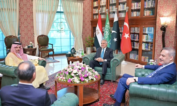 The foreign ministers of Pakistan, Saudi Arabia, Turkiye and Egypt reviewed the evolving regional situation during a high-level quadrilateral meeting in Islamabad, the Foreign Office said on Sunday. Convened at the invitation of Deputy Prime Minister and Foreign Minister Ishaq Dar, the participants of the meeting discussed issues of mutual interest, the FO said. The quadrilateral mechanism is being viewed as a key diplomatic track feeding into wider efforts to end the conflict, with a focus on consolidating regional backing for de-escalation, aligning positions ahead of any possible US-Iran talks, and facilitating dialogue. Though neither Washington nor Tehran attended the meet, it is still being viewed as a preparatory step toward a broader diplomatic opening. Meanwhile, the participants of the moot in Islamabad will also call on Prime Minister Shehbaz Sharif. Egyptian FM Abdelatty and Turkiye’s FM Hakan Fidan landed in Pakistan on Saturday night, while Saudi Arabia’s Prince Faisal bin Farhan Al Saud arrived on Sunday afternoon. Several roads leading to Islamabad’s Red Zone — where key government buildings and diplomatic missions are based — were sealed off, AFP reporters said. Security was tight and the driveway of the foreign ministry was decorated with the flags of all four countries. Meeting with Turkish FM Before the quadrilateral moot, Dar also held separate meetings with his counterparts from Turkiye, Egypt and Saudi Arabia. He and Türkiye Foreign Minister Hakan Fidan, in their meeting at the FO ahead of the larger talks, “reaffirmed Pakistan’s commitment to expanding cooperation with Türkiye across all sectors of mutual interest”, according to an FO press release. During the meeting, Dar “underscored the historic and fraternal ties between Pakistan and Türkiye, rooted in shared history, culture, and mutual respect”. The deputy premier expressed satisfaction at the positive trajectory of bilateral relations. “The discussions provided an opportunity to review the full spectrum of bilateral relations and explore avenues for strengthening the longstanding strategic partnership between the two brotherly countries, ” the FO statement read. “The two leaders also exchanged views on recent regional developments, including the evolving situation in Iran, and emphasised the importance of dialogue and sustained diplomatic engagement to promote peace and stability, ” it added. Both sides reaffirmed their “unwavering support for each other’s core national interests, agreed to maintain close coordination, and to continue working together to deepen the strategic partnership between Pakistan and Türkiye”, the FO noted. Meeting with Egypt FM Abdelatty Prior to the discussions with the Turkish FM, Dar held a separate meeting with Egyptian FM Dr Badr Abdelatty, with the two reaffirming their countries’ “commitment to further strengthening cooperation across all domains”, the FO said in a press release. Abdelatty’s visit is regarded as a “follow-up to recent high-level contacts between the two sides”, including discussions held in Riyadh earlier this month, as well as the Egyptian FM’s Pakistan trip in Nov 2025, during which he met with Dar, President Asif Ali Zardari and Chief of Army Staff Field Marshal Asim Munir. The FO said the meetings reflect the “close coordination between Pakistan and Egypt on evolving regional developments”. As both sides reviewed the full spectrum of bilateral relations, they expressed satisfaction with the positive trajectory of defence and security cooperation, agreeing to further strengthen collaboration through training exchanges and other institutional mechanisms, the FO said. They stressed the need to enhance bilateral trade and investment, with agreement on the importance of activating bilateral mechanisms, including a Joint Ministerial Commission, and promoting business-to-business linkages. Dar “appreciated Egypt’s continued support in the health sector, particularly in combating Hepatitis-C, and welcomed ongoing collaboration in this area”, the statement further said. Discussing the ongoing situation in the Middle East, the two sides “underscored the need for restraint, de-escalation, and the resolution of disputes through dialogue and diplomacy”, the FO said. Both sides were satisfied with the positive momentum generated through recent high-level exchanges. Dar had welcomed his Egyptian counterpart at the MoFA and “reaffirmed that Pakistan attaches great importance to its longstanding and brotherly relations with Egypt, anchored in shared history, common faith, and a convergence of views on regional and international issues”. He reaffirmed Pakistan’s unwavering support for the Palestinian people and strongly condemned the continued aggression by Israeli occupying forces in Gaza and the West Bank. He appreciated Egypt’s role in facilitating humanitarian assistance to the people of Gaza, including support extended to Pakistan’s relief efforts. Both sides agreed to continue “close coordination” at multilateral fora, including the United Nations and the Organisation of Islamic Cooperation (OIC). “The meeting reaffirmed the shared commitment of Pakistan and Egypt to further strengthen their close and brotherly relations and to deepen cooperation across all areas of mutual interest, ” the FO observed. Meeting with Saudi FM Dar also held a separate meeting with Saudi Foreign Minister Prince Faisal bin Farhan Al Saud, the FO said, adding that the two leaders held detailed discussions on the evolving regional and international developments. “They underscored the importance of dialogue, diplomacy, and collective efforts to promote peace, security and stability in the region, ” according to the FO. It further stated that the two sides reaffirmed “their commitment for closer engagement” and agreed to continue working together at bilateral and multilateral levels to further strengthe