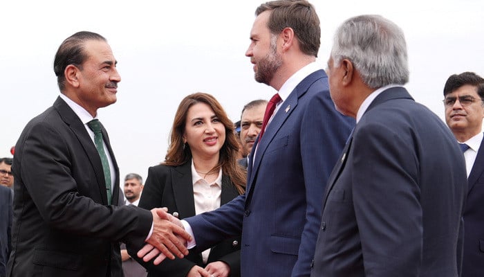US Vice President JD Vance shakes hands with Chief of Defence Forces and Chief of Army Staff Field Marshall Asim Munir as Charge d’Affaires of the US Embassy in Islamabad Natalie A. Baker and Deputy Prime Minister and Foreign Minister Mohammad Ishaq Dar look on, after arriving for talks. ..