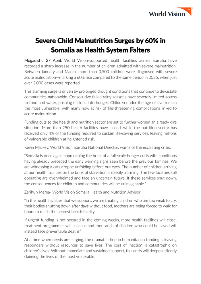 Country: Somalia Source: World Vision Please refer to the attached file. Mogadishu 27 April: World Vision-supported health facilities across Somalia have recorded a sharp increase in the number of children admitted with severe malnutrition. Between January and March, more than 3, 500 children were diagnosed with severe acute malnutrition—marking a 60% rise compared to the same period in 2025, when just over 2, 000 cases were reported. This alarming surge is driven by prolonged drought conditions that continue to devastate communities nationwide. Consecutive failed rainy seasons have severely limited access to food and water, pushing millions into hunger. Children under the age of five remain the most vulnerable, with many now at risk of life-threatening complications linked to acute malnutrition. Funding cuts to the health and nutrition sector are set to further worsen an already dire situation. More than 250 health facilities have closed, while the nutrition sector has received only 4% of the funding required to sustain life-saving services, leaving millions of vulnerable children at heightened risk. Kevin Mackey, World Vision Somalia National Director, warns of the escalating crisis: “Somalia is once again approaching the brink of a full-scale hunger crisis with conditions having already preceded the early warning signs seen before the previous famines. We are witnessing a catastrophe unfolding before our eyes. The number of children arriving at our health facilities on the brink of starvation is deeply alarming. The few facilities still operating are overwhelmed and face an uncertain future. If these services shut down, the consequences for children and communities will be unimaginable. ” Zerihun Merea- World Vision Somalia Health and Nutrition Advisor: “In the health facilities that we support, we are treating children who are too weak to cry, their bodies shutting down after days without food, mothers are being forced to walk for hours to reach the nearest health facility If urgent funding is not secured in the coming weeks, more health facilities will close, treatment programmes will collapse and thousands of children who could be saved will instead face preventable deaths” At a time when needs are surging, the dramatic drop in humanitarian funding is leaving responders without resources to save lives. The cost of inaction is catastrophic on children’s lives. Without immediate and sustained support, this crisis will deepen, silently claiming the lives of the most vulnerable. About World Vision World Vision is a Christian humanitarian organisation dedicated to working with children, families and their communities to reach their full potential by tackling the root causes of poverty and injustice. World Vision serves all people, regardless of religion, race, ethnicity or gender. For media inquiries, please contact: Walter Mawere. World Vision Somalia Communication and Marketing Manager Walter_mawere@wvi. org Joyce Kivata Regional Communications and Public Engagement Manager Joyce_Kivata@wvi. org