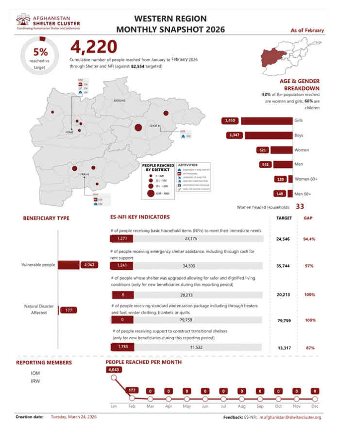 Shelter Cluster Afghanistan: Western Region Monthly Snapshot (As of February 2026)