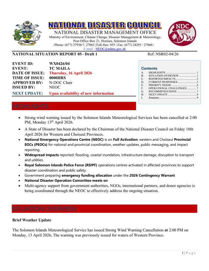 Country: Solomon Islands Source: Government of Solomon Islands Please refer to the attached file. Highlights Strong wind warning issued by the Solomon Islands Meteorological Services has been cancelled at 2: 00 PM, Monday 13th April 2026. A State of Disaster has been declared by the Chairman of the National Disaster Council on Friday 10th April 2026 for Western and Choiseul Provinces. National Emergency Operations Centre (NEOC) is on Full Activation; western and Choiseul Provincial EOCs (PEOCs) for national and provincial coordination, weather updates, public messaging, and impact reporting. Widespread impacts reported: flooding, coastal inundation, infrastructure damage, disruption to transport and utilities. Royal Solomon Islands Police Force (RSIPF) operations centres activated in affected provinces to support disaster coordination and public safety. Government preparing emergency funding allocation under the 2026 Contingency Warrant Multi-agency support from government authorities, NGOs, international partners, and donor agencies is being coordinated through the NEOC to effectively address the ongoing situation.