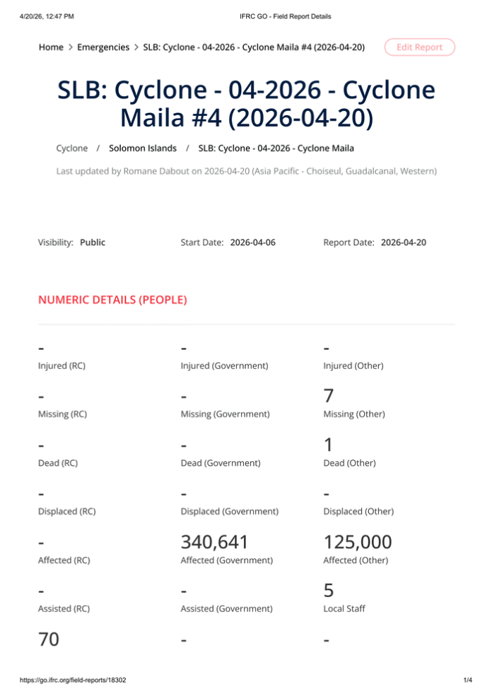 Country: Solomon Islands Sources: International Federation of Red Cross and Red Crescent Societies, Solomon Islands Red Cross Society Please refer to the attached file. Description TC Maila started to develop on 4 April 2026 and intensified to a Category 5 cyclone by 8 April 2026. On the 10 April, the government declared a State of Disaster for Western and Choiseul province. The system gradually weakened to a tropical low by 11 April 2026. The most severe impacts have been reported in Western Province, with significant damage also recorded in Choiseul and Isabel Provinces. One loss of life has been reported in Wagina and seven people remain missing in Marovo as of 13 April. About 21 health facilities have been impacted. The WASH situation on Simbo Island is considered critical, due to groundwater contamination and damaged water systems. A suspected diarrhoeal outbreak has been reported in Babanga and Simbo. An unconfirmed number of people remain displaced, facing shortages of food and water. About 31, 945 individuals require emergency shelter and essential household items. 59 schools has been damaged affecting 2000 children in Western and Choiseul provinces. Request For Assistance Government Requests International Assistance No NS Requests International Assistance Yes Information Bulletin Published Requested Actions taken by RCRC General Other Summary: – Actions taken by National Society General Damage/Needs assessment Relief/Supply distribution Summary SIRC mobilized personnel to conduct damage and impact assessment. As communication and access remain limited, assessment will continue in the following weeks. SIRC has activated its National EOC as the coordination point with the affected branches. The Solomon Islands Red Cross is utilizing pre-positioned stocks for immediate distribution. SIRC is requesting a DREF operation that will target 31, 945 people and provide shelter relief items, basic humanitarian health services, and environmental cleaning activities. Actions taken by Federation General Other Summary IFRC Country Cluster Delegation monitors the system development, impact and forecast and communicates and coordinates with SIRCS on daily basis for update and support required. Technical support is provided in developing DREF plan and budget. The Asia Pacific Regional Office shares information across the network and supports coordinated response and DREF processes. APRO has analysed and generated CCA and maps. Actions taken by others WASH: • World Vision International has sent 4 staff to support the assessment on one island and distributed 98 pieces of Hygiene Kits and 210 collapsible Jerrycans to nearly 100 HH. • UNICEF and MHMS have deployed over 1100 water containers or buckets, 200 tap filters, 1675 units of WASH & Dignity Kits • RWASH staff are also being deployed to Choiseul and Western province to support the ground coordination of supplies, providing training to install the water filters and distribution of supplies. • ADRA has distributed over 100 pcs of soap, and 100 packages of Hygiene Kits in Western Province. Health: UNFPA and UNICEF dispatched medical supplies and the Ministry of Health sent pharmaceuticals and medicals consumables to Western Province on 14 April. UNFPA sent 50 Dignity kits and reproductive health kits to Honiara for dispatch. IOM delivers NFIs, including solar lamps, kitchen sets, and blankets Shelter: IOM is activating the Displacement Tracking Matrix (DTM) to formalize data collection on evacuees. ADRA is conducting rapid on-site assessments. Education: UNICEF will provide tents for temporary learning spaces and distributes teaching and learning materials. Coordination: National Emergency Operations Centre (NEOC) fully activated. OCHA IMO desployed to the NEOC supporting Initial Damage Assessment. Relief operations are constrained by limited availability of functional boats and fuel. There is a critical need for assessments across all sectors, challenged by remote locations, adverse weather, and limited communications. Planned International Response DREF: Requested Rapid Response Personnel: Requested
