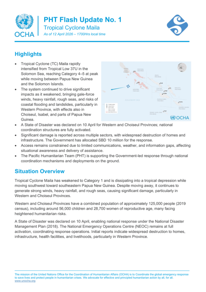 Country: Solomon Islands Source: UN Office for the Coordination of Humanitarian Affairs Please refer to the attached file. Situation Overview Tropical Cyclone Maila has weakened to Category 1 and is dissipating into a tropical depression while moving southwest toward southeastern Papua New Guinea. Despite moving away, it continues to generate strong winds, heavy rainfall, and rough seas, causing significant damage, particularly in Western and Choiseul Provinces. Western and Choiseul Provinces have a combined population of approximately 125, 000 people (2019 census), including around 56, 000 children and 28, 700 women of reproductive age, many facing heightened humanitarian risks. A State of Disaster was declared on 10 April, enabling national response under the National Disaster Management Plan (2018). The National Emergency Operations Centre (NEOC) remains at full activation, coordinating response operations. Initial reports indicate widespread destruction to homes, infrastructure, health facilities, and livelihoods, particularly in Western Province. Impact and Needs Access to affected communities remains constrained by limited communications, adverse weather, and incomplete damage assessments, limiting situational awareness and response planning. Air and maritime logistics are operational; however, information gaps and localized landslides continue to hinder last-mile access. Health: Damage to health facilities, staff housing, water systems, and solar infrastructure is disrupting services. An estimated 3, 220 pregnant women, including 400 expected to give birth within a month, face reduced access to care, with at least four secondary-level facilities partially functional. Priority needs include restoring maternal and newborn services, deploying mobile teams, implementing MISP, and providing essential supplies. WASH: Damage to water and sanitation systems is increasing contamination risks. Priority needs include water treatment, safe storage, hygiene items, dignity kits, and kitchen kits. Shelter and infrastructure: Assessments are ongoing. Pre-positioned shelter and NFI stocks are available but limited. Communications remain constrained. Priority needs include assessments, replenishment of stocks, and improved communications access. Displacement: Displacement is reported, with needs for NFIs, coordination, and population movement tracking. Food security and livelihoods: Impacts are reported; partners are preparing for assessments and early recovery. Protection: Risks related to GBV and PSEA are identified, requiring protection mainstreaming across the response. Education: At least 32 schools are impacted in Western and Choiseul, with additional reports from Central and Guadalcanal. Assessments are ongoing. Priority needs include temporary learning spaces, supplies, and WASH support.
