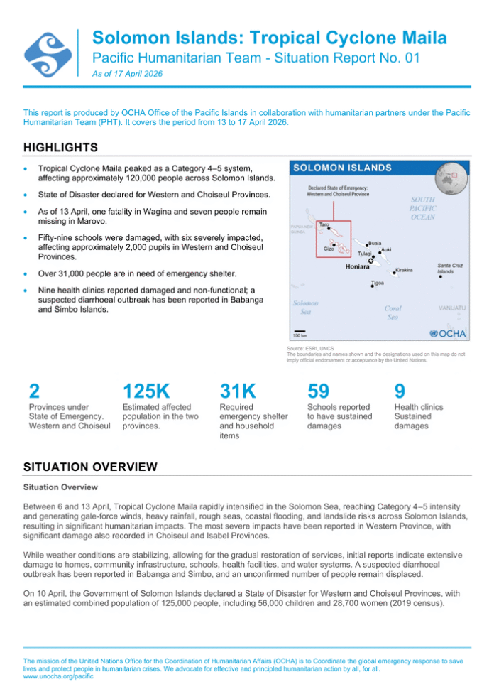 Country: Solomon Islands Source: UN Office for the Coordination of Humanitarian Affairs Please refer to the attached file. HIGHLIGHTS Tropical Cyclone Maila peaked as a Category 4–5 system, affecting approximately 120, 000 people across Solomon Islands. State of Disaster declared for Western and Choiseul Provinces. As of 13 April, one fatality in Wagina and seven people remain missing in Marovo. Fifty-nine schools were damaged, with six severely impacted, affecting approximately 2, 000 pupils in Western and Choiseul Provinces. Over 31, 000 people are in need of emergency shelter. Nine health clinics reported damaged and non-functional; a suspected diarrhoeal outbreak has been reported in Babanga and Simbo Islands. SITUATION OVERVIEW Between 6 and 13 April, Tropical Cyclone Maila rapidly intensified in the Solomon Sea, reaching Category 4–5 intensity and generating gale-force winds, heavy rainfall, rough seas, coastal flooding, and landslide risks across Solomon Islands, resulting in significant humanitarian impacts. The most severe impacts have been reported in Western Province, with significant damage also recorded in Choiseul and Isabel Provinces. While weather conditions are stabilizing, allowing for the gradual restoration of services, initial reports indicate extensive damage to homes, community infrastructure, schools, health facilities, and water systems. A suspected diarrhoeal outbreak has been reported in Babanga and Simbo, and an unconfirmed number of people remain displaced. On 10 April, the Government of Solomon Islands declared a State of Disaster for Western and Choiseul Provinces, with an estimated combined population of 125, 000 people, including 56, 000 children and 28, 700 women (2019 census). National and provincial response efforts are currently focused on deploying Initial Damage Assessment (IDA) teams and distributing life-saving supplies. Response operations remain constrained by logistical challenges and the continued use of schools as evacuation centres. The Government allocated SBD 10 million to address immediate needs, while Pacific Humanitarian Team (PHT) partners are supporting sectoral response efforts in line with priorities identified by national sector committees and lead line ministries.