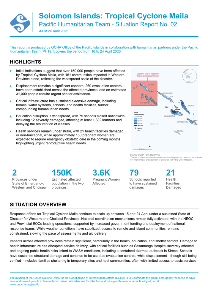 Country: Solomon Islands Source: UN Office for the Coordination of Humanitarian Affairs Please refer to the attached file. HIGHLIGHTS Initial indications suggest that over 150, 000 people have been affected by Tropical Cyclone Maila, with 161 communities impacted in Western Province alone, reflecting the widespread scale of the disaster. Displacement remains a significant concern. 260 evacuation centers have been established across the affected provinces, and an estimated 31, 000 people require urgent shelter assistance. Critical infrastructure has sustained extensive damage, including homes, water systems, schools, and health facilities, further compounding humanitarian needs. Education disruption is widespread, with 79 schools closed nationwide, including 12 severely damaged, affecting at least 1, 382 learners and delaying the resumption of classes. Health services remain under strain, with 21 health facilities damaged or non-functional, while approximately 180 pregnant women are expected to require emergency obstetric care in the coming months, highlighting urgent reproductive health needs. SITUATION OVERVIEW Response efforts for Tropical Cyclone Maila continue to scale up between 15 and 24 April under a sustained State of Disaster for Western and Choiseul Provinces. National coordination mechanisms remain fully activated, with the NEOC and Provincial EOCs leading operations, supported by increased government funding and deployment of national response teams. While weather conditions have stabilized, access to remote and island communities remains constrained, slowing the pace of assessments and aid delivery. Impacts across affected provinces remain significant, particularly in the health, education, and shelter sectors. Damage to health infrastructure has disrupted service delivery, with critical facilities such as Sasamunga Hospital severely affected and ongoing public health risks linked to WASH conditions, including a contained diarrhea outbreak in Simbo. Schools have sustained structural damage and continue to be used as evacuation centres, while displacement—though still being verified—includes families sheltering in temporary sites and host communities, often with limited access to basic services. Response operations have expanded, with increased logistics movements, deployment of assessment teams, and distribution of relief supplies by government and partners. National and international actors, including NGOs and UN agencies, are supporting food and non-food item distributions, health outreach, and initial damage assessments. However, uneven distribution of assistance persists, particularly in hard-to-reach areas, and data gaps continue to limit precise targeting of needs. Priority needs remain high across multiple sectors, including emergency shelter, safe water, food assistance, and restoration of health services. Significant operational challenges continue to affect the response, notably fuel shortages, limited transport and storage capacity, and insufficient human resources, particularly in health. Ongoing risks include waterborne disease outbreaks, inadequate shelter for displaced populations, and delays in restoring essential services, especially in remote and underserved communities.