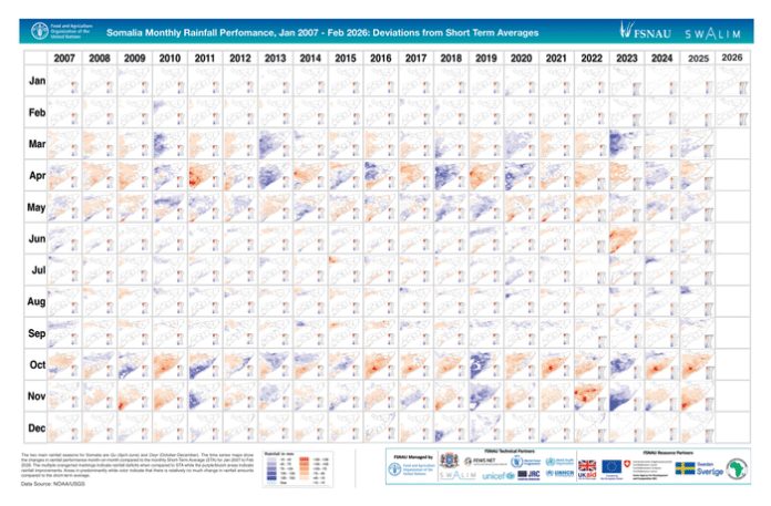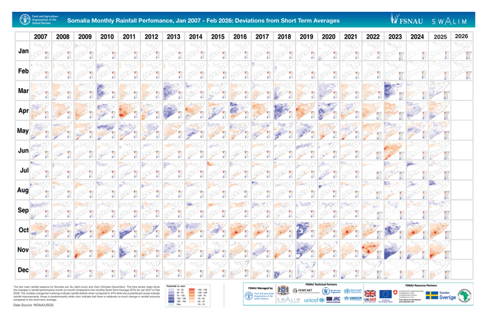 Somalia Monthly Rainfall Perfomance, Jan 2007 – Feb 2026: Deviations from Short Term Averages