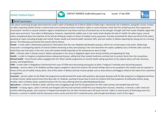 Country: Somalia Source: Radio Ergo Please refer to the attached file. Brief Summary Calls about continuing drought dominated this week’s batch of feedback (9-15 March 2026) to Radio Ergo’s nationwide call-in platform, alongside a lesser number of callers reporting rainfall mainly in central and across scattered southern locations. Callers in some locations noted that the rainfall was less than expected or inconsistent. Farmers in several southern regions complained of crop failure and loss of livestock due to the drought. Drought calls from Lower Shabelle region this week were prominent. Two callers in Beletweyne, however, reported the sudden rise in river water levels despite the lack of rainfall. On other topics, several callers complained about the rejection of the Somali shilling by traders in favour of mobile money payments. Females accounted for about one third of the callers, speaking on topics including drought and rainfall, floods, health and mental health, livestock, IDPs, and one mother in Dollow reporting her young son as a missing person. The following summarises the overall calls by theme. Floods – a male caller in Beletweyne passed on information that the river Shabelle had flooded causing a child to be carried away in the water. (Radio Ergo newsroom is investigating reports of several children drowning as they were playing in the river bed when the waters suddenly rose.) A female caller said that whilst they now had water in the river, they still needed rainfall especially as the temperatures were so high. IDPs – a female caller in Daryel camp in Adado said people in the camp in Galgadud region were facing hardship and appealing for help. Health – a caller in Hargeisa complained about widespread disease, adding that they needed medicines and bed nets to protect them from the mosquitoes. Mental health – three female callers engaged with the ‘Mind’ weekly programme on mental health asking questions to the experts about self-talk, dizziness, anxiety, and forgetfulness. FGM – a male caller in Mogadishu commented that cases of FGM were decreasing among girls as other (‘religious’) methods were becoming popular. Currency – several callers in M. Shabelle and Bay regions weighed in about the need for the Somali shilling notes to be accepted in the market and not rejected in favour of the use of mobile money alone. One of the callers in Baidoa said low-income people such as shoe-shiners and beggars relied on the notes from customers or supporters. Livestock – women callers to the Radio Vet programme predominated this week with questions about goat diseases with flu-like symptoms in Galgadud and Hiran. A chicken farmer called several times from Biyo-ade, M. Shabelle, wanting to know how to treat his chickens that had symptoms of suffocation before dying. Another caller in Dollow, Gedo, wanted treatment for his cows suffering what he called Madobaad disease. Agriculture – a farmer in Bardera, Gedo, said they were struggling to get fuel for the generators for their water pumps and needed help with fuel. Rainfall – in Sanag region, callers in Armale and Hingalol said they had received rainfall that was helping their recovery. However, in Armale a caller cited clan conflicts affecting people, and a woman in Hingalol said despite the rain their livestock were still weak and sick. Callers in several parts of Galmudug cited rain. However, a woman in Adado said the downpours were scanty and only fell in scattered areas, with drought prevailing in much of the region. Among a few callers from parts of M. Shabelle, one in Balad said the rain was little and people were migrating in search of better rainfall. He said they were praying for more rainfall that would be sufficient to help recovery of the vulnerable families. In Bay, a caller from a village about 7 kilometres from Baidoa said they had rainfall and their livestock were recovering from the drought. Several called about rainfall in parts of Gedo, and Lower Juba including Kismayo. Drought and impact – in Somaliland, a female caller in an unspecified location said they were grappling with drought and food shortage, their livestock were dying due to water shortage, and they needed aid. Two callers in Togdher, including one in Qoryalle, said the drought conditions were continuing to affect them despite rain falling in some other areas. In Mudug, a female caller in Harardhere said their livestock were dying and they hadn’t had any rain. Among several from Adado, three female callers said they were facing severe drought with livestock dying and no aid. They asked for their voices to be shared for response from aid organisations. A caller in Biyo-Gadud said the rains had failed and there was intense heat and livestock were dying of water shortage. A caller in Astur complained of drought and water shortage in the area, as well as a lack of health facilities. He said people wanted response from the federal and Galmudug governments. Two callers from Beletweyne said farms and livestock were affected by the lack of rain. Among several callers from Middle Shabelle, a woman said they were facing food and water shortages after their farms had failed. A caller in Raga-elle said livestock were dying. Among many callers from Lower Shabelle, especially Kuntawarey and Wanleweyn districts, farmers said they had planted and their crops had failed. A female caller said they needed aid due to the drought and that their children were all sick. Several callers from Baidoa and Bardale in Bay region said drought conditions continued without any rainfall, livestock were dying, and they needed aid.