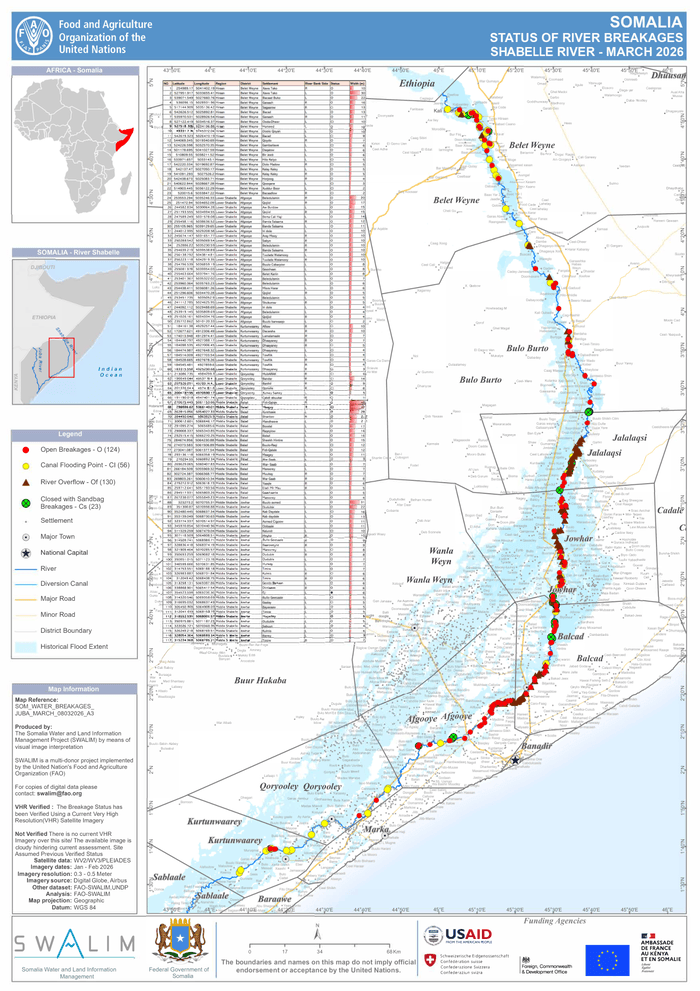 HomeEnvironmentSomalia: Status of River Breakages River Shabelle, March 2026 Environment Somalia: Status of River Breakages River Shabelle, March 2026 By muhammadhasan0426@gmail.com March 26, 2026 0 1 Share FacebookTwitterPinterestWhatsApp Country: Somalia Source: Food and Agriculture Organization of the United Nations Please refer to the attached Map. Read full story on Reliefweb Share FacebookTwitterPinterestWhatsApp Previous articlePlanned salary cuts for Indonesian public officials welcomedNext articleCiti’s co-head of Asia investment banking Metzger joins StanChart RELATED ARTICLES Environment Middle East tensions push up cost of key plastics ingredient used in medical supplies March 26, 2026 Environment Haleji Lake: A sanctuary for native, migratory waterfowl March 26, 2026 Environment Somalia Monthly Rainfall Perfomance, Jan 2007 – Feb 2026: Deviations from Short Term Averages March 26, 2026 LEAVE A REPLY Cancel reply Comment: Please enter your comment! Name:* Please enter your name here Email:* You have entered an incorrect email address! Please enter your email address here Website: Save my name, email, and website in this browser for the next time I comment. - Advertisment - Most Popular Vinicius Jr seeks to bring Real Madrid magic to Brazil at World Cup March 26, 2026 کم عمر مسیحی لڑکیوں کی مسلمان لڑکوں سے شادی پر آئینی عدالت کا اہم فیصلہ March 26, 2026 جیٹ فیول کی قیمتوں میں بڑے اضافے کے بعد فضائی سفر مزید مہنگا ہوگیا March 26, 2026 پاکستان نے کتنے علامی تنازعات میں ثالث کا کردار ادا کیا؟ March 26, 2026 Load more Recent Comments