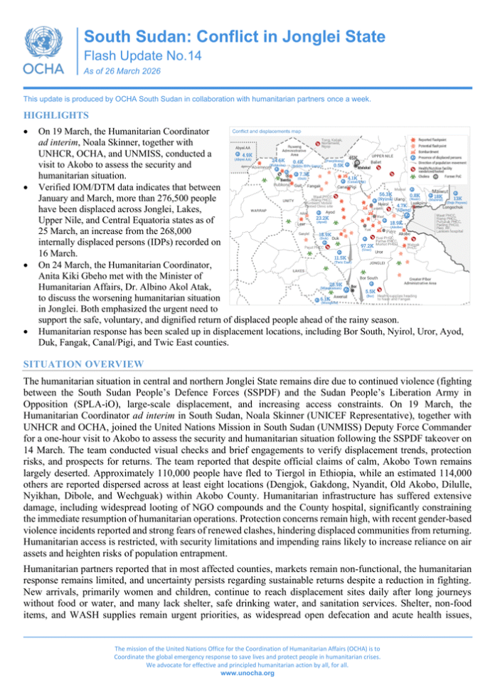 Country: South Sudan Source: UN Office for the Coordination of Humanitarian Affairs Please refer to the attached file. HIGHLIGHTS On 19 March, the Humanitarian Coordinator ad interim, Noala Skinner, together with UNHCR, OCHA, and UNMISS, conducted a visit to Akobo to assess the security and humanitarian situation. Verified IOM/DTM data indicates that between January and March, more than 276, 500 people have been displaced across Jonglei, Lakes, Upper Nile, and Central Equatoria states as of 25 March, an increase from the 268, 000 internally displaced persons (IDPs) recorded on 16 March. On 24 March, the Humanitarian Coordinator, Anita Kiki Gbeho met with the Minister of Humanitarian Affairs, Dr. Albino Akol Atak, to discuss the worsening humanitarian situation in Jonglei. Both emphasized the urgent need to support the safe, voluntary, and dignified return of displaced people ahead of the rainy season. Humanitarian response has been scaled up in displacement locations, including Bor South, Nyirol, Uror, Ayod, Duk, Fangak, Canal/Pigi, and Twic East counties. SITUATION OVERVIEW The humanitarian situation in central and northern Jonglei State remains dire due to continued violence (fighting between the South Sudan People’s Defence Forces (SSPDF) and the Sudan People’s Liberation Army in Opposition (SPLA-iO), large-scale displacement, and increasing access constraints. On 19 March, the Humanitarian Coordinator ad interim in South Sudan, Noala Skinner (UNICEF Representative), together with UNHCR and OCHA, joined the United Nations Mission in South Sudan (UNMISS) Deputy Force Commander for a one-hour visit to Akobo to assess the security and humanitarian situation following the SSPDF takeover on 14 March. The team conducted visual checks and brief engagements to verify displacement trends, protection risks, and prospects for returns. The team reported that despite official claims of calm, Akobo Town remains largely deserted. Approximately 110, 000 people have fled to Tiergol in Ethiopia, while an estimated 114, 000 others are reported dispersed across at least eight locations (Dengjok, Gakdong, Nyandit, Old Akobo, Dilulle, Nyikhan, Dibole, and Wechguak) within Akobo County. Humanitarian infrastructure has suffered extensive damage, including widespread looting of NGO compounds and the County hospital, significantly constraining the immediate resumption of humanitarian operations. Protection concerns remain high, with recent gender-based violence incidents reported and strong fears of renewed clashes, hindering displaced communities from returning. Humanitarian access is restricted, with security limitations and impending rains likely to increase reliance on air assets and heighten risks of population entrapment. Humanitarian partners reported that in most affected counties, markets remain non-functional, the humanitarian response remains limited, and uncertainty persists regarding sustainable returns despite a reduction in fighting. New arrivals, primarily women and children, continue to reach displacement sites daily after long journeys without food or water, and many lack shelter, safe drinking water, and sanitation services. Shelter, non-food items, and WASH supplies remain urgent priorities, as widespread open defecation and acute health issues, including diarrhoea, malnutrition, and pneumonia, continue to increase needs. Nutrition supplies have been unavailable in displacement locations for months, further exacerbating vulnerabilities, while the risk of cholera remains imminent. Between 18 and 24 March, 155 new cholera cases and two deaths were reported in nine counties: Ayod (62), Yirol East (28), Duk (22), Mayom (13), Uror (10), Awerial (7), Bor South (7), Panyijiar (5), and Juba (1). On 24 March, the Humanitarian Coordinator in South Sudan, Ms. Anita Kiki Gbeho, met with the Minister of Humanitarian Affairs and Disaster Management, Dr. Albino Akol Atak, to discuss the worsening humanitarian situation following renewed armed clashes in central and northern Jonglei State. Both sides stressed the urgent need to support the safe, voluntary, and dignified return of displaced people, especially with the rainy season approaching. The Minister confirmed the Government’s readiness to coordinate assistance for the most vulnerable. Ms. Gbeho reaffirmed the UN’s support to ensure returnees can access essential services, including shelter, water, health care, and food, so they can rebuild their lives. The meeting highlighted the shared commitment of national and international partners to scale up a coordinated response and address both immediate needs and longer-term recovery in Jonglei State. The Minister and the Humanitarian Coordinator further agreed to activate the 2026 Floods Task Force, which will be co-chaired by the Chairperson of the Relief and Rehabilitation Commission and OCHA. The State Inter-Cluster Coordination Group in Bor is planning an inter-agency rapid needs assessment mission to Akobo East Payam in Akobo County to assess the needs of an estimated 100, 000 reported IDPs across Nyandit, Gakdong, Dengjok, Wechguak, Dilulle, Dibole, and Nyikhan, where people are reported to be concentrated. The mission is scheduled to depart Bor on 30 March and return on 2 April. HUMANITARIAN IMPACT AND NEEDS Displacement: Verified IOM/DTM data indicates that between January and March, more than 276, 500 people have been displaced across Jonglei, Lakes, Upper Nile, and Central Equatoria states as of 25 March, an increase from the 268, 000 internally displaced persons (IDPs) recorded on 16 March. According to UNHCR, an estimated 110, 000 people have fled across the border into Ethiopia since the start of the crisis. Civilians continue to flee daily, many facing repeated displacement and heightened protection concerns. Looting of health facilities and impact on the population: Since the conflict began in late December 2025, reports from the World Health Organization (WHO) confirm that 26 health