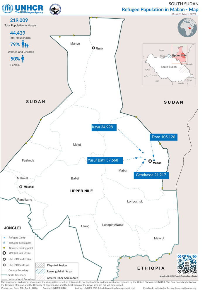 HomePoliticsSouth Sudan - Refugee Population in Maban - 31 March 2026 Politics South Sudan – Refugee Population in Maban – 31 March 2026 By muhammadhasan0426@gmail.com April 28, 2026 0 2 Share FacebookTwitterPinterestWhatsApp Countries: South Sudan, Sudan Source: UN High Commissioner for Refugees Please refer to the attached Map. Read full story on Reliefweb Share FacebookTwitterPinterestWhatsApp Previous articleSouth Sudan – Refugee and Asylum-seeker Population – 31 March 2026Next articleSouth Sudan – UNHCR Operational Presence Map (as of 31 March 2026) RELATED ARTICLES Politics South Sudan: Sudan Situation: Refugees and Asylum-seekers Movement and Presence – March 2026 April 28, 2026 Politics South Sudan – UNHCR Operational Presence Map (as of 31 March 2026) April 28, 2026 Politics South Sudan – Refugee and Asylum-seeker Population – 31 March 2026 April 28, 2026 LEAVE A REPLY Cancel reply Comment: Please enter your comment! Name:* Please enter your name here Email:* You have entered an incorrect email address! Please enter your email address here Website: Save my name, email, and website in this browser for the next time I comment. - Advertisment - Most Popular Imran Khan again undergoes eye examination at PIMS: Barrister Gohar April 28, 2026 چین کے دورے پر صدر زرداری کی شاؤشان آمد، چیئرمین ماؤ کی سیاسی زندگی کے اہم گوشوں پر بریفنگ April 28, 2026 Short Film“White Paper” Explores Young Azerbaijani Writer’s Creative Breakdown April 28, 2026 K-pop girl group Le Sserafim bringing Pureflow world tour to Singapore this November April 28, 2026 Load more Recent Comments