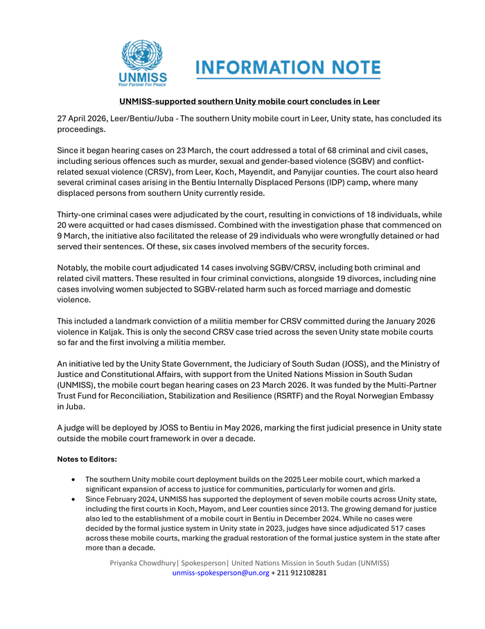 Country: South Sudan Source: UN Mission in South Sudan Please refer to the attached file. LEER/BENTIU/JUBA – The southern Unity mobile court in Leer, Unity state, has concluded its proceedings. Since it began hearing cases on 23 March, the court addressed a total of 68 criminal and civil cases, including serious offences such as murder, sexual and gender-based violence (SGBV) and conflict-related sexual violence (CRSV), from Leer, Koch, Mayendit, and Panyijar counties. The court also heard several criminal cases arising in the Bentiu Internally Displaced Persons (IDP) camp, where many displaced persons from southern Unity currently reside. Thirty-one criminal cases were adjudicated by the court, resulting in convictions of 18 individuals, while 20 were acquitted or had cases dismissed. Combined with the investigation phase that commenced on 9 March, the initiative also facilitated the release of 29 individuals who were wrongfully detained or had served their sentences. Of these, six cases involved members of the security forces. Notably, the mobile court adjudicated 14 cases involving SGBV/CRSV, including both criminal and related civil matters. These resulted in four criminal convictions, alongside 19 divorces, including nine cases involving women subjected to SGBV-related harm such as forced marriage and domestic violence. This included a landmark conviction of a militia member for CRSV committed during the January 2026 violence in Kaljak. This is only the second CRSV case tried across the seven Unity state mobile courts so far and the first involving a militia member. An initiative led by the Unity State Government, the Judiciary of South Sudan (JOSS), and the Ministry of Justice and Constitutional Affairs, with support from the United Nations Mission in South Sudan (UNMISS), the mobile court began hearing cases on 23 March 2026. It was funded by the Multi-Partner Trust Fund for Reconciliation, Stabilization and Resilience (RSRTF) and the Royal Norwegian Embassy in Juba. A judge will be deployed by JOSS to Bentiu in May 2026, marking the first judicial presence in Unity state outside the mobile court framework in over a decade. Notes to Editors: The southern Unity mobile court deployment builds on the 2025 Leer mobile court, which marked a significant expansion of access to justice for communities, particularly for women and girls. Since February 2024, UNMISS has supported the deployment of seven mobile courts across Unity state, including the first courts in Koch, Mayom, and Leer counties since 2013. The growing demand for justice also led to the establishment of a mobile court in Bentiu in December 2024. While no cases were decided by the formal justice system in Unity state in 2023, judges have since adjudicated 517 cases across these mobile courts, marking the gradual restoration of the formal justice system in the state after more than a decade.