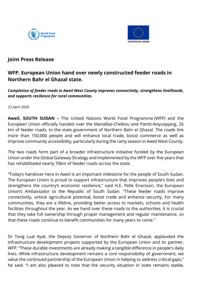 Country: South Sudan Sources: European Union, World Food Programme Please refer to the attached file. Completion of feeder roads in Aweil West County improves connectivity, strengthens livelihoods, and supports resilience for rural communities. Aweil, SOUTH SUDAN – The United Nations World Food Programme (WFP) and the European Union officially handed over the Marialbai-Chelkou and Pantit-Anyuopjang, 26 km of feeder roads, to the state government of Northern Bahr el Ghazal. The roads link more than 150, 000 people and will enhance local trade, boost commerce as well as improve community accessibility, particularly during the rainy season in Aweil West County. The two roads form part of a broader infrastructure initiative funded by the European Union under the Global Gateway Strategy and implemented by the WFP over five years that has rehabilitated nearly 70km of feeder roads across the state. “Today’s handover here in Aweil is an important milestone for the people of South Sudan. The European Union is proud to support infrastructure that improves people’s lives and strengthens the country’s economic resilience, ” said H. E. Pelle Enarsson, the European Union’s Ambassador to the Republic of South Sudan. “These feeder roads improve connectivity, unlock agricultural potential, boost trade and enhance security. For many communities, they are a lifeline, providing better access to markets, schools and health facilities throughout the year. As we hand over these roads to the authorities, it is crucial that they take full ownership through proper management and regular maintenance, so that these roads continue to benefit communities for many years to come*. ”* Dr Tong Lual Ayat, the Deputy Governor of Northern Bahr el Ghazal, applauded the infrastructure development projects supported by the European Union and its partner, WFP. “These durable investments are already making a tangible difference in people’s daily lives. While infrastructure development remains a core responsibility of government, we value the continued partnership of the European Union in helping to address critical gaps, ” he said. “I am also pleased to note that the security situation in state remains stable, providing an enabling environment for further development, including the expansion of essential services such as healthcare and education.” South Sudan, despite its vast territory, has a very limited road network, with just over 20, 000 kilometres of roads, only a small portion of which are paved. During the rainy season, many roads, particularly in rural areas, become inaccessible. More than three-quarters of the country’s 12. 4 million population residing outside urban centres, making the country’s limited infrastructure a major constraint for development and sustainable growth. With resources from the European Union and other partners, WFP is constructing and upgrading vital public infrastructure including roads in parts of the country. *“*This road is more than mere infrastructure, it is a vital lifeline, ” says Adham Effendi, WFP’s Acting Country Director. “It reduces isolation, particularly during the rainy season, lowers transport costs for users, and enhances access to markets, health facilities, and schools. Such roads will not only improve food security and drive economic transformation but also contribute significantly to social cohesion and peaceful coexistence. ” The rehabilitation of these two feeder roads is part of the ‘Feeder Roads to Strengthen Livelihoods and Resilience of Rural Communities’ project, funded by the European Union with EUR 22. 1 million and implemented by WFP in four states and nine counties. The project aims to improve the living conditions and resilience of rural communities by enhancing connectivity, strengthening livelihoods, increasing food system efficiency and fostering social cohesion. Other senior government officials at national and state levels, representatives from the European Union and other stakeholders, also attended the handover ceremony in Aweil, north-west South Sudan, on Wednesday. # # # For more information please contact: Tomson Phiri, WFP, Tomson. Phiri@wfp. org, +211 928 008 037 Francis Lagu, EU, Political, Press and Information Section, Francis-Apiliga. LAGU@eeas. eu, +211 928184384