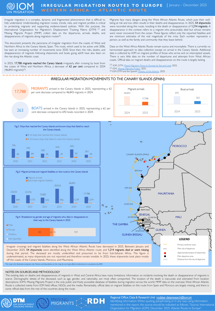 Countries: Spain, Canary Islands (Spain), Equatorial Guinea, Guinea-Bissau, Mali, Mauritania, Morocco, Senegal Source: International Organization for Migration Please refer to the attached Infographic. This document presents the panorama of irregular migration from the coasts of West and Northern Africa to the Canary Islands, Spain. This route, which used to be active until 2006, has seen an increasing number of movements since 2020. Since then, the risks, deaths, and disappearances of migrants following shipwrecks and boats going adrift have also been on the rise along the Atlantic coast. In 2025, 17, 788 migrants reached the Canary Islands irregularly after crossing by boat from the coasts of West and Northern Africa, a decrease of 62 per cent compared to 2024 (46, 843 migrants). Migrants face many dangers along the West African Atlantic Route, which puts their wellbeing at risk and too often results in their deaths and disappearances. In 2025, 54 shipwrecks were recorded along this route, resulting in the death or disappearance of 1, 214 migrants.