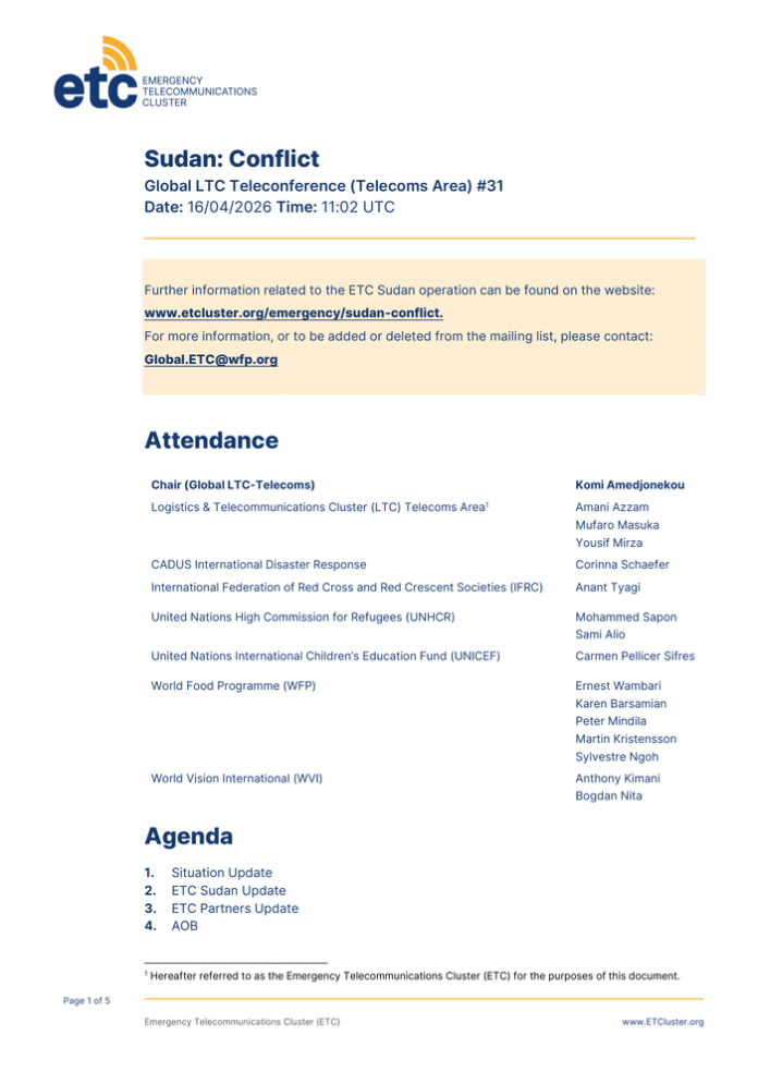Sudan, conflict Global LTC Teleconference (Telecoms Area) #31 (Date: 16/04/2026 Time: 11:02 UTC)