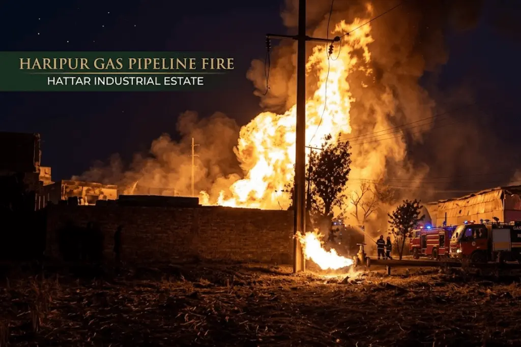The Hattar Industrial Estate fire in the Haripur district of Khyber Pakhtunkhwa (KP), Pakistan, injured 11 people in a gas line fire, now reported as the Haripur gas pipeline fire. A Sui Northern Gas Pipelines Limited (SNGPL) pipeline leaked, which started the fire. This put a stop to all work in the area. It also. ..