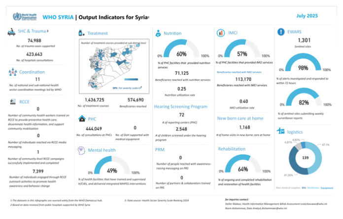HomePoliticsSyria: WHO Output Indicators - July 2025 Politics Syria: WHO Output Indicators – July 2025 By muhammadhasan0426@gmail.com March 29, 2026 0 2 Share FacebookTwitterPinterestWhatsApp Country: Syrian Arab Republic Source: Health Cluster Please refer to the attached file. Read full story on Reliefweb Share FacebookTwitterPinterestWhatsApp Previous articleایپل آئی فون 18 پرو سمیت 11 نئے ماڈلز لانچ کرنے کے لیے تیارNext articleICT Police put 39 lawbreakers in handcuffs; Drugs, weapons recovered RELATED ARTICLES Politics جو مِلے تھے راستے میں (1) March 29, 2026 Politics کیا قیامت قریب تر آ گئی ہے؟ March 29, 2026 Politics گندم کے کاشتکاروں کے مسائل March 29, 2026 LEAVE A REPLY Cancel reply Comment: Please enter your comment! Name:* Please enter your name here Email:* You have entered an incorrect email address! Please enter your email address here Website: Save my name, email, and website in this browser for the next time I comment. - Advertisment - Most Popular Who is Mae Martin? All about the Toronto comedian hosting JUNO Awards this year March 29, 2026 ادویات کی قیمتوں میں اضافے سے متعلق خبروں ڈریپ کی وضاحت , اہم ایڈوائزریز بھی جاری March 29, 2026 میرااورشان کی فلم ’’سائیکو‘‘ کا ٹریلر لانچ کردیا گیا March 29, 2026 Stranded whale freed from sandbank off German coast March 29, 2026 Load more Recent Comments