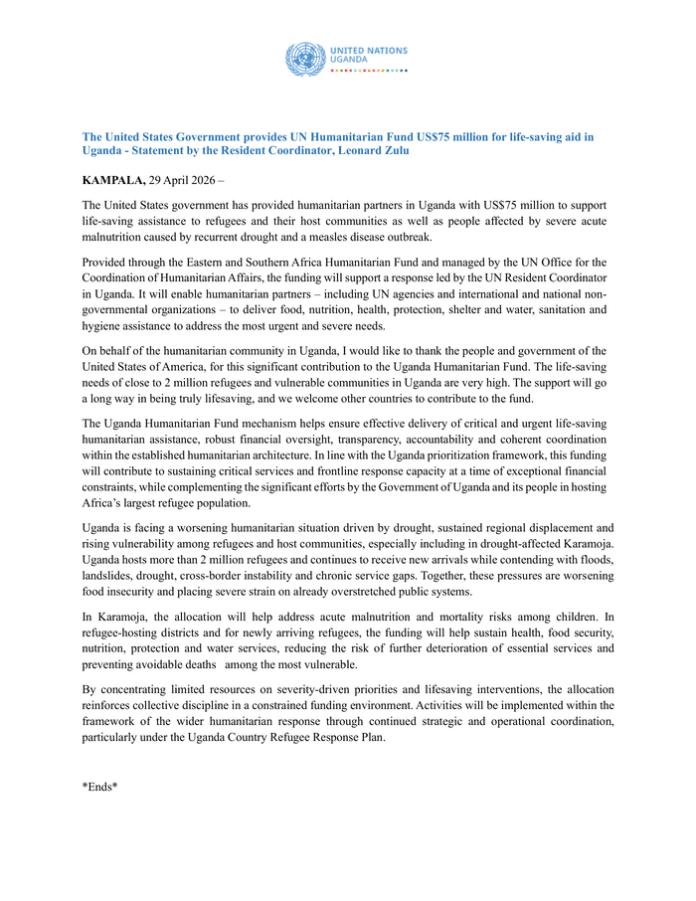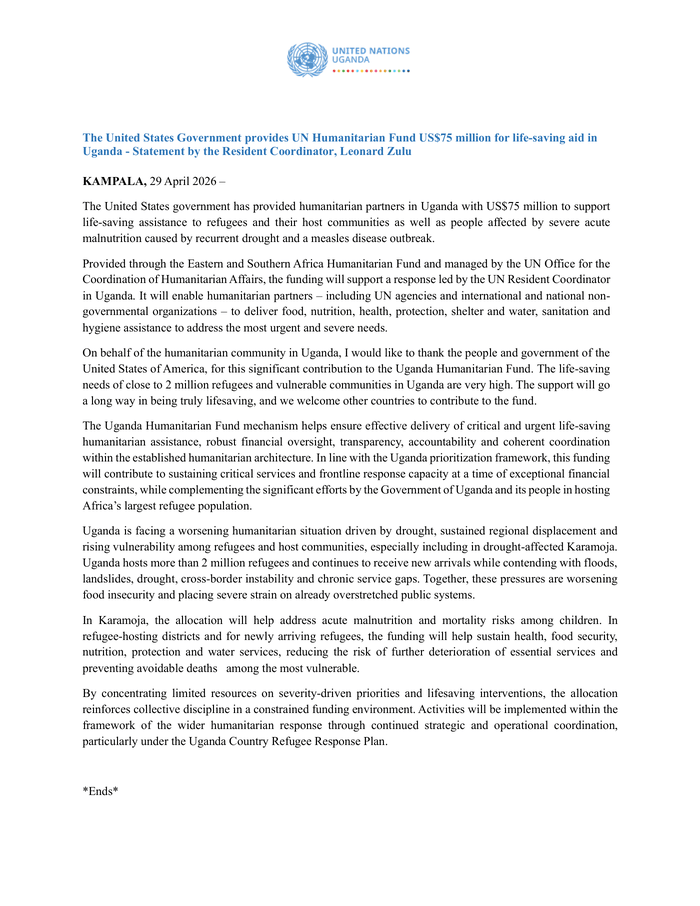 Countries: Uganda, Democratic Republic of the Congo, South Sudan, United States of America Source: UN Resident Coordinator in Uganda Please refer to the attached file. KAMPALA, 29 April 2026 The United States government has provided humanitarian partners in Uganda with US$75 million to support life-saving assistance to refugees and their host communities as well as people affected by severe acute malnutrition caused by recurrent drought and a measles disease outbreak. Provided through the Eastern and Southern Africa Humanitarian Fund and managed by the UN Office for the Coordination of Humanitarian Affairs, the funding will support a response led by the UN Resident Coordinator in Uganda. It will enable humanitarian partners – including UN agencies and international and national non-governmental organizations – to deliver food, nutrition, health, protection, shelter and water, sanitation and hygiene assistance to address the most urgent and severe needs. On behalf of the humanitarian community in Uganda, I would like to thank the people and government of the United States of America, for this significant contribution to the Uganda Humanitarian Fund. The life-saving needs of close to 2 million refugees and vulnerable communities in Uganda are very high. The support will go a long way in being truly lifesaving, and we welcome other countries to contribute to the fund. The Uganda Humanitarian Fund mechanism helps ensure effective delivery of critical and urgent life-saving humanitarian assistance, robust financial oversight, transparency, accountability and coherent coordination within the established humanitarian architecture. In line with the Uganda prioritization framework, this funding will contribute to sustaining critical services and frontline response capacity at a time of exceptional financial constraints, while complementing the significant efforts by the Government of Uganda and its people in hosting Africa’s largest refugee population. Uganda is facing a worsening humanitarian situation driven by drought, sustained regional displacement and rising vulnerability among refugees and host communities, especially including in drought‐affected Karamoja. Uganda hosts more than 2 million refugees and continues to receive new arrivals while contending with floods, landslides, drought, cross‐border instability and chronic service gaps. Together, these pressures are worsening food insecurity and placing severe strain on already overstretched public systems. In Karamoja, the allocation will help address acute malnutrition and mortality risks among children. In refugee‐hosting districts and for newly arriving refugees, the funding will help sustain health, food security, nutrition, protection and water services, reducing the risk of further deterioration of essential services and preventing avoidable deaths among the most vulnerable. By concentrating limited resources on severity-driven priorities and lifesaving interventions, the allocation reinforces collective discipline in a constrained funding environment. Activities will be implemented within the framework of the wider humanitarian response through continued strategic and operational coordination, particularly under the Uganda Country Refugee Response Plan. *Ends*