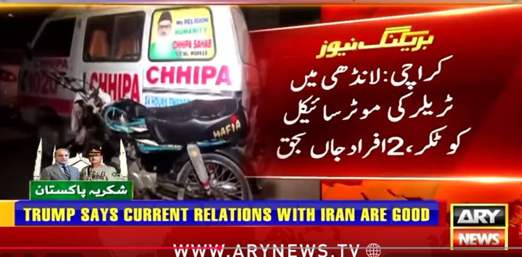 HomeCrimeTrailer crushes two teenagers to death in Karachi Crime Trailer crushes two teenagers to death in Karachi By muhammadhasan0426@gmail.com April 17, 2026 0 2 Share FacebookTwitterPinterestWhatsApp KARACHI: Two teenagers were crushed to death after a speeding trailer hit their motorcycle in Karachi, ARY News reported on Friday. Read full story on Ary News Share FacebookTwitterPinterestWhatsApp Previous articlePSX rises as hopes of Middle East tensions easing lift sentimentNext articleBig Relief Coming? NA Finance Committee Unanimously Recommends 50% Cut in PTA Mobile Taxes RELATED ARTICLES Crime Azerbaijan, Russia Agree on Resolution After 2024 AZAL Aircraft Crash April 19, 2026 Crime لاہور ڈویلپمنٹ پروگرام: فیز II پر 66 فیصد پیشرفت مکمل April 19, 2026 Crime Engr Muhammad Ali Mirza survives gun attack in Jhelum, assailant killed in police firing April 19, 2026 LEAVE A REPLY Cancel reply Comment: Please enter your comment! Name:* Please enter your name here Email:* You have entered an incorrect email address! Please enter your email address here Website: Save my name, email, and website in this browser for the next time I comment. - Advertisment - Most Popular اریکا حق کے ساتھ تعلقات؛عاشر وجاہت نے خاموشی توڑدی April 19, 2026 One Star, Two Looks: Maya Ali’s dual roles leave fans stunned April 19, 2026 Pope Leo seeks to ease tensions with Trump over remarks April 19, 2026 Sajal Aly serves candid charm in ‘Zanjeerain Bts’ April 19, 2026 Load more Recent Comments