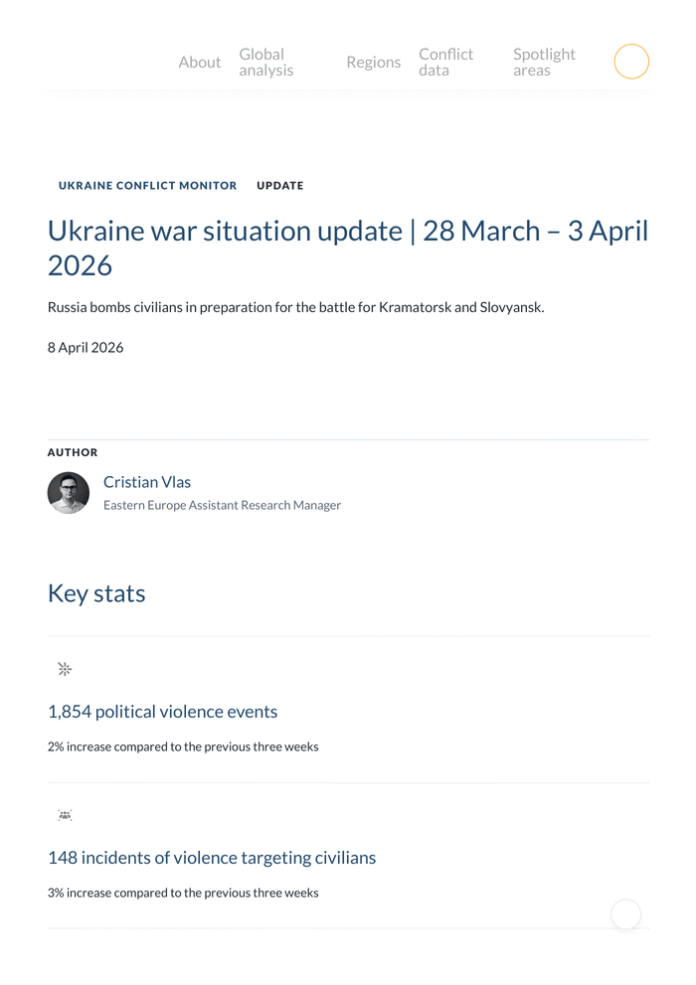 Country: Ukraine Source: Armed Conflict Location & Event Data Please refer to the attached file. Key events 28 Mar. Odesa — More than 60 Russian drones kill three civilians and injure 14 in Odesa city and port 1 Apr. Cherkasy — Four civilians die after approaching a crashed Russian drone in the Zolotoniskyi district when it exploded 2 Apr. Bashkortostan, Russia — A Ukrainian drone strike damages an oil refinery in Ufa, 2, 000 km away from Ukraine Key trends Russian forces occupied a village northeast of Sumy in the Sumy region and another near Vovchansk in the Kharkiv region. They also claimed control over two settlements near Orikhiv and Ternuvate in the Zaporizhia region and advanced near Kostiantynivka and Lyman in the Donetsk region. Ukrainian forces reclaimed a settlement in the Dnipropetrovsk region in its counter-offensive near the administrative boundary with the Zaporizhia region. Russian forces launched at least 57 long-range missile and drone attacks, including on the western regions of Lviv, Zakarpattia, Volyn, Ternopil, and Chernivtsi. Russian strikes killed at least 58 civilians in the Donetsk, Kharkiv, Kherson, Sumy, Dnipropetrovsk, Poltava, Odesa, Zaporizhia, Chernihiv, Zhytomyr, Mykolaiv, and Kyiv regions. Ukrainian drone strikes reportedly killed four civilians in the Russian-controlled parts of the Zaporizhia and Kherson regions. Spotlight: Russia prepares to capture Kramatorsk and Slovyansk with unprecedented civilian bombing As they gradually surround and occupy the town of Kostiantynivka, Russian forces now eye the capture of Kramatorsk and Slovyansk, the two fortress cities still under Ukrainian control in the Donetsk region. Russian forces are preparing the battleground for the seizure of the urban agglomeration headed by these two cities, not only through the prioritization of additional troop deployments, 1 but also by bombing and targeting civilian infrastructure and remaining civilians almost daily. On 3 April, Russian forces launched at least five aerial bombs at the city of Kramatorsk, killing six civilians and injuring eight others, while damaging residential buildings, educational and energy infrastructure, and an ambulance near a civilian evacuation point. Earlier in the week, on 30 March, Russian aerial bombs also damaged a maternity hospital and injured at least four civilians in Slovyansk. These events underline the evergrowing threat not just to Ukrainian military logistics in the Kramatorskyi district of the Donetsk region, but also to the humanitarian hubs and civilians living in or evacuated from front line locations. In Slovyansk, the regional authorities recently began mandatory evacuations of children and their guardians from the most exposed streets of the city, 2 whereas authorities in Kramatorsk began the process back in October 2025. 3 In comparison to the first three months of 2025, Russian targeting of civilians in the Kramatorskyi district increased almost threefold in the number of events and fatalities in 2026, as the front line was pushed closer to the Slovyansk-Kramatorsk-Kostiantynivka agglomeration. The impact on civilians was compounded by Russia’s indiscriminate and extensive use of modernized guided aerial bombs and first-person-view drones against both military and civilian targets. Following their strategy of total destruction in front line regions to strong-arm Ukraine into ceding the Donbas region, Russian forces are seemingly doubling down on capturing territories devoid of populations and infrastructure at any cost to capture the Donetsk region by the end of 2026.
