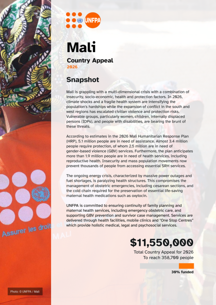 Country: Mali Source: United Nations Population Fund Please refer to the attached file. Mali is facing a complex, multi-dimensional crisis driven by insecurity, socio-economic pressures, and gaps in health and protection services. In 2026, climate shocks and a fragile health system are deepening vulnerabilities, while the spread of conflict into the south and west has intensified violence against civilians and heightened protection risks. The most affected are vulnerable groups—particularly women, children, internally displaced persons, and people with disabilities. An estimated 5. 1 million people require humanitarian assistance. Of these, nearly 3. 4 million need protection services, including 2. 5 million who require gender-based violence (GBV) support. In addition, over 1. 9 million people need access to healthcare, including reproductive health services. Severe funding shortages have led to the cancellation of 12, 500 caesarean section kits—almost 40 per cent of national needs—restricting access to essential emergency obstetric care for pregnant women, whose assisted birth rate remains below 50 per cent. UNFPA is committed to ensuring the continuity of family planning and maternal health services, including emergency obstetric care, and supporting GBV prevention and survivor case management. Services are delivered through health facilities, mobile clinics, and One Stop Centres which provide holistic medical, legal and psychosocial services. In 2026, UNFPA requires a total of US$ 11. 55 million to reach 193, 700 people with SRH services and 165, 000 people with GBV prevention and response programmes in Mali. As of April, the total amount received is US $3. 54 million, leaving 70 per cent of the required funding still unmet.