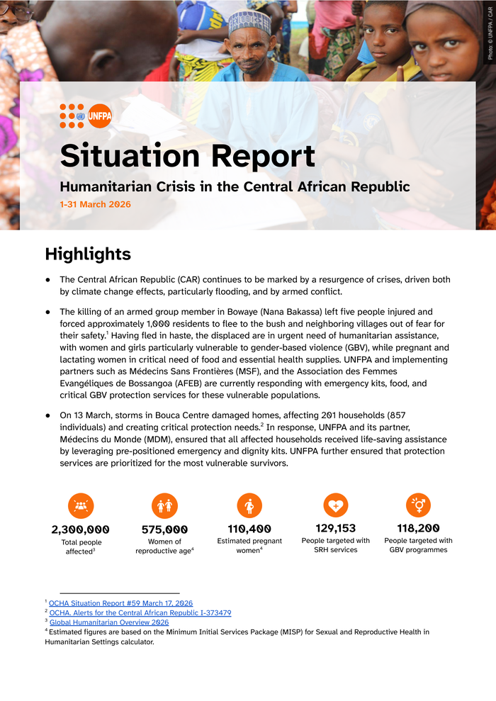 Countries: Central African Republic, Sudan Source: United Nations Population Fund Please refer to the attached file. In March 2026, the Central African Republic (CAR) faced overlapping security and climate-related crises. On 11 March, an attack in Bowaye injured five people and forced approximately 1, 000 residents to flee. Displaced in haste, affected populations are in urgent need of humanitarian assistance. Women and girls face heightened risks of gender-based violence (GBV), while pregnant and lactating women require immediate access to food and essential health services. In response, UNFPA and its implementing partners are providing emergency kits, food assistance, and critical protection services. On 13 March, severe storms in Bouca Centre damaged homes and affected 857 people, creating acute protection needs. UNFPA, in partnership with Médecins du Monde, responded by ensuring affected households received life-saving support through the distribution of pre-positioned emergency and dignity kits. Overall, in March, UNFPA supported 1, 566 individuals with sexual and reproductive health (SRH) services and delivered 15 reproductive health kits to service delivery points, meeting the needs of an estimated 3, 750 people. In addition, 5, 324 people were reached with GBV prevention, mitigation, and response interventions through community awareness activities, and nine women and girls’ safe spaces. Furthermore, 1, 638 young people accessed life-saving information and referral services on family planning, HIV/AIDS, and GBV through 13 youth centres and support kiosks. In 2026, UNFPA requires US$13. 2 million to sustain its humanitarian operations in CAR. As of March, US$2. 2 million has been mobilized, including funds carried over from 2025 and new contributions from KOICA and the UNFPA Emergency Fund. However, 82 per cent of the required funding remains unmet, posing significant risks to the continuity of essential SRH, GBV, and youth programmes in CAR.