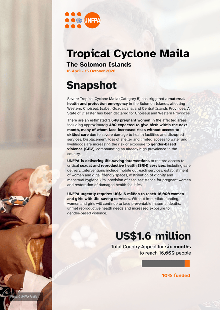 Country: Solomon Islands Source: United Nations Population Fund Please refer to the attached file. Severe Tropical Cyclone Maila (Category 5) has triggered a maternal health and protection emergency in the Solomon Islands, affecting Western, Choiseul, Isabel, Guadalcanal and Central Islands Provinces. A State of Disaster has been declared for Choiseul and Western Provinces. There are an estimated 3, 640 pregnant women in the affected areas including approximately 400 expected to give birth within the next month, many of whom face increased risks without access to skilled care due to severe damage to health facilities and disrupted services. Displacement, loss of shelter and limited access to water and livelihoods are increasing the risk of exposure to gender-based violence (GBV), compounding an already high prevalence in the country. UNFPA is delivering life-saving interventions to restore access to critical sexual and reproductive health (SRH) services, including safe delivery. Interventions include mobile outreach services, establishment of women and girls’ friendly spaces, distribution of dignity and menstrual hygiene kits, provision of cash assistance for pregnant women and restoration of damaged health facilities. UNFPA urgently requires US$1. 6 million to reach 16, 000 women and girls with life-saving services. Without immediate funding, women and girls will continue to face preventable maternal deaths, unmet reproductive health needs and increased exposure to gender-based violence.