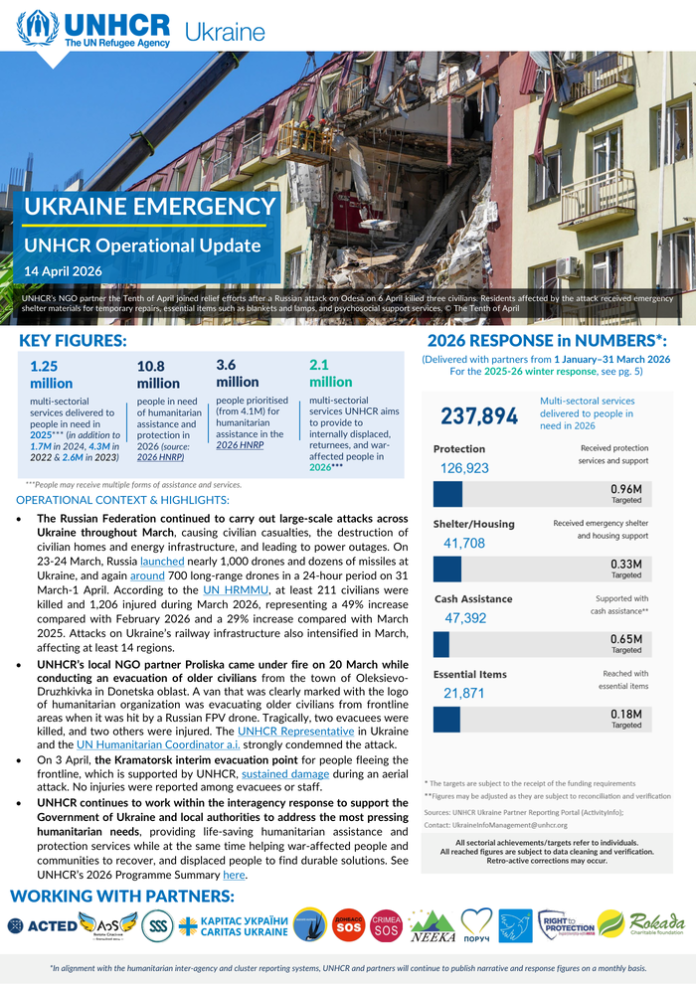 Country: Ukraine Source: UN High Commissioner for Refugees Please refer to the attached file. OPERATIONAL CONTEXT & HIGHLIGHTS: • The Russian Federation continued to carry out large-scale attacks across Ukraine throughout March, causing civilian casualties, the destruction of civilian homes and energy infrastructure, and leading to power outages. On 23-24 March, Russia launched nearly 1, 000 drones and dozens of missiles at Ukraine, and again around 700 long-range drones in a 24-hour period on 31 March-1 April. According to the UN HRMMU, at least 211 civilians were killed and 1, 206 injured during March 2026, representing a 49% increase compared with February 2026 and a 29% increase compared with March 2025. Attacks on Ukraine’s railway infrastructure also intensified in March, affecting at least 14 regions. • UNHCR’s local NGO partner Proliska came under fire on 20 March while conducting an evacuation of older civilians from the town of OleksievoDruzhkivka in Donetska oblast. A van that was clearly marked with the logo of humanitarian organization was evacuating older civilians from frontline areas when it was hit by a Russian FPV drone. Tragically, two evacuees were killed, and two others were injured. The UNHCR Representative in Ukraine and the UN Humanitarian Coordinator a. i. strongly condemned the attack. • On 3 April, the Kramatorsk interim evacuation point for people fleeing the frontline, which is supported by UNHCR, sustained damage during an aerial attack. No injuries were reported among evacuees or staff. • UNHCR continues to work within the interagency response to support the Government of Ukraine and local authorities to address the most pressing humanitarian needs, providing life-saving humanitarian assistance and protection services while at the same time helping war-affected people and communities to recover, and displaced people to find durable solutions.