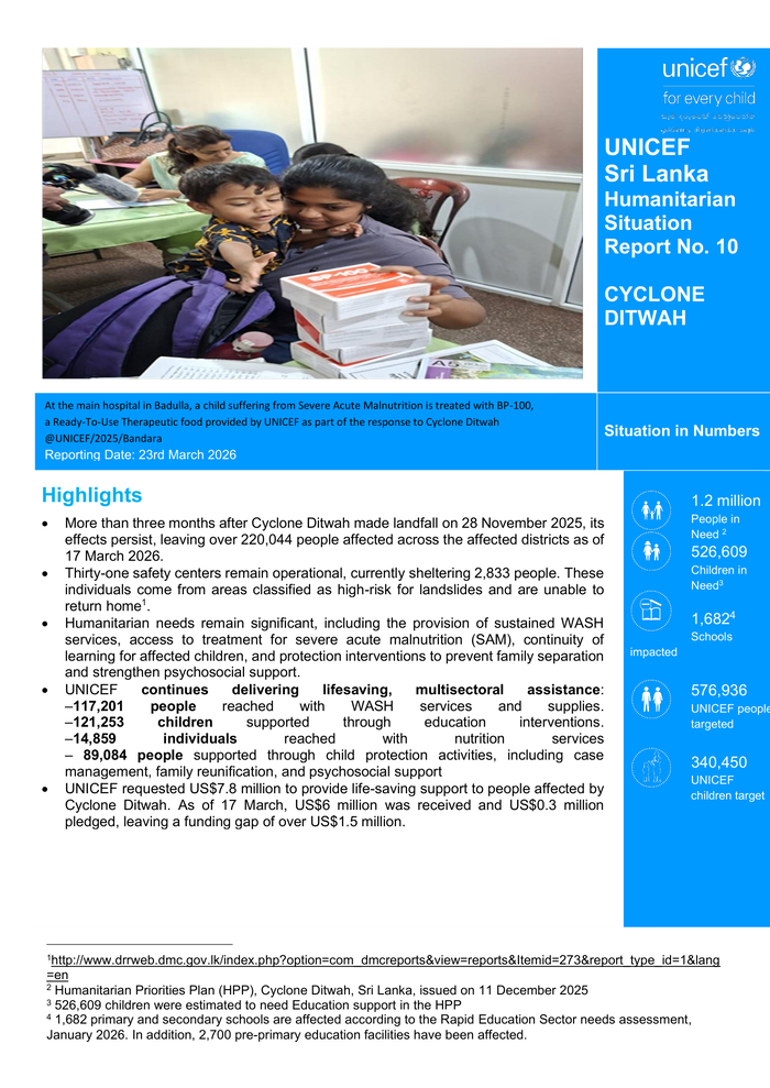 Country: Sri Lanka Source: UN Children’s Fund Please refer to the attached file. Highlights More than three months after Cyclone Ditwah made landfall on 28 November 2025, its effects persist, leaving over 220, 044 people affected across the affected districts as of 17 March 2026. Thirty-one safety centers remain operational, currently sheltering 2, 833 people. These individuals come from areas classified as high-risk for landslides and are unable to return home [1]. Humanitarian needs remain significant, including the provision of sustained WASH services, access to treatment for severe acute malnutrition (SAM), continuity of learning for affected children, and protection interventions to prevent family separation and strengthen psychosocial support. UNICEF continues delivering lifesaving, multisectoral assistance: –117, 201 people reached with WASH services and supplies. –121, 253 children supported through education interventions. –14, 859 individuals reached with nutrition services – 89, 084 people supported through child protection activities, including case management, family reunification, and psychosocial support UNICEF ordered US$2. 3 million in emergency supplies, with additional supplies over US$992. 000 million in the pipeline. UNICEF requested US$7. 8 million to provide life-saving support to people affected by Cyclone Ditwah. As of 17 March, US$6 million was received and US$0. 3 million pledged, leaving a funding gap of over US$1. 5 million.