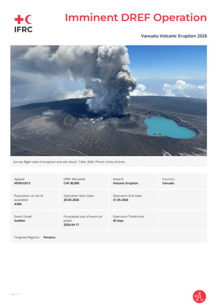 Country: Vanuatu Source: International Federation of Red Cross and Red Crescent Societies Please refer to the attached file. Scenario analysis When and where is the hazard expected to happen? Ambae Island remains an active volcanic environment due to ongoing activity at Manaro Voui. Increased volcanic activity was observed in early 2026, with reports of gas emissions, ashfall, and environmental impacts affecting surrounding communities. On 19 February 2026, the Vanuatu Meteorology and Geo-Hazards Department (VMGD) reported increased volcanic activity, including gas emissions and dark plumes from the vent. On 23 February 2026, the volcanic alert level was raised to Level 3 (Minor Eruption), indicating increased activity but with impacts largely localised. At present, the volcanic activity remains confined within Lake Voui at the summit crater. The officially designated volcanic hazard area corresponds to Danger Zone B, which covers approximately a 3 km radius around the active vent. This zone is considered hazardous due to the risk of volcanic projectiles, ashfall, gas emissions, and other volcanic hazards that may occur at any time. While the immediate danger zone is limited to the summit area, ashfall has already been reported in several communities on Ambae. Ground observations between 22 and 23 February 2026 confirmed that communities in the southern and south-eastern parts of Ambae, particularly those located downwind of the volcano, are experiencing volcanic ashfall. Ashfall may continue depending on wind direction and plume height, potentially affecting additional areas of the island as well as nearby islands exposed to prevailing trade winds. Volcanic ash and gas emissions are already affecting surrounding communities. Ashfall has been reported in several parts of Ambae, particularly in the southern and south-eastern areas located downwind of the volcano. The ashfall has begun to contaminate rainwater harvesting systems and surface water sources, which are the primary sources of drinking water for many households. Communities have also reported health concerns associated with ash exposure, including respiratory irritation, coughing, red eyes, and skin irritation. In addition, ash accumulation on roofs and agricultural land is beginning to affect household living conditions and local food production, raising concerns about the continued safety of shelters and potential impacts on livelihoods. VMGD monitoring indicates that volcanic activity may continue in the coming weeks. Should volcanic activity intensify further, an escalation of the alert level could lead to heavier ashfall, increased gas emissions, and wider environmental impacts affecting additional communities across Ambae Island. Streams and watercourses may also pose a risk during periods of heavy rainfall due to ash deposits, which may lead to abnormal water flow or contamination. Given the uncertainty surrounding the evolution of the volcanic activity and the potential for rapid escalation, preparedness measures are required to reduce humanitarian risks and support communities that may be affected by ashfall, water contamination, and related health impacts.