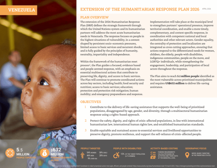Country: Venezuela (Bolivarian Republic of) Source: UN Office for the Coordination of Humanitarian Affairs Please refer to the attached file. The extension of the 2026 Humanitarian Response Plan (HRP) defines the strategic framework through which the United Nations system and its humanitarian partners will address the most acute humanitarian needs in Venezuela. The response focuses on people in the highest situations of vulnerability, in a context shaped by persistent socio-economic pressures, limited access to basic services and recurrent shocks, and is fully guided by the principles of humanity, neutrality, impartiality and independence. Within the framework of the humanitarian reset process1, the Plan guides a focused, evidence based and people centred response, with an emphasis on essential multisectoral actions that contribute to preserving life, dignity, and access to basic services. The Plan will continue to promote coordinated actions across key sectors, including health; food security and nutrition; access to basic services; education; protection and protection risk mitigation; human mobility; and emergency preparedness and response. Implementation will take place at the municipal level to strengthen partners’ operational presence, improve territorial coordination, and enable a more timely, complementary, and context specific response, in coordination with competent national and local authorities and other relevant actors. Gender equality, the centrality of protection and localization are integrated as cross cutting approaches, ensuring that actions respond to the differentiated needs for women, children, the elderly, people with disabilities, indigenous communities, people on the move, and LGBTQ+ individuals, while strengthening the engagement, leadership, and participation of local actors throughout the response. The Plan aims to reach 5. 1 million people identified as the most vulnerable across prioritized municipalities and requires US$632 million to deliver life-saving assistance.