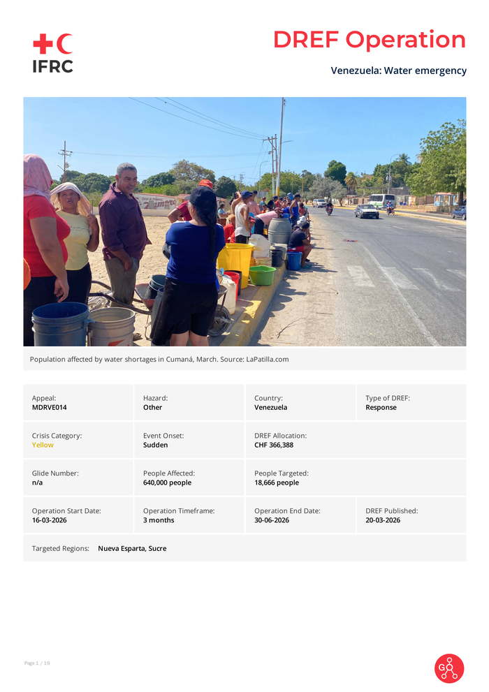 Country: Venezuela (Bolivarian Republic of) Source: International Federation of Red Cross and Red Crescent Societies Please refer to the attached file. Description of the Event Date of event 06-03-2026 What happened, where and when? he Bolivarian Republic of Venezuela is currently experiencing a major crisis affecting basic services in its eastern regions, particularly in the states of Sucre and Nueva Esparta. This follows the formal declaration of a Critical Water Emergency in the Official Gazette of the State of Sucre No. 3, 247, dated 5 March 2026. This measure responds to a large-scale structural failure in the Turimiquire collection and distribution system — the most important strategic infrastructure in eastern Venezuela — which supplies drinking water to the continental area of Sucre State (covering the municipalities of Sucre, Bolívar and Cruz Salmerón Acosta) and the island area. The system affects 45% of the population of Margarita Island in the state of Nueva Esparta, which depends on its underwater branch via a complex network of underwater pipelines and aqueducts. According to the technical report by the regional hydrological agency (Hidrocaribe), dated 3 March 2026, a rockslide at kilometre 7. 6 of the 12. 5 km transfer tunnel caused an obstruction of 82% of the tunnel’s capacity. This drastically reduced the system’s response capacity from 5, 000 litres per second to 1, 100 litres per second. This explains why there is not enough pressure in the water supply to reach the ‘high areas’ of Sucre and Nueva Esparta. According to the media and local authorities, the collapse has been directly attributed to aftershocks and ground instability caused by an earthquake recorded in the region on 22 February 2022. This earthquake weakened infrastructure that was already compromised by decades of use, according to official spokespeople, including Governor Jhoanna Carrillo. This emergency has had a negative multidimensional impact, affecting the lives of approximately 95, 108 families in one of the three affected municipalities in Sucre state. It has also compromised access to water for 45% of Nueva Esparta state’s population, who depend on the underwater branch of the same system. In health terms, there is an imminent risk of an increase in waterborne and dermatological diseases due to inadequate storage of the resource in open containers and use of untreated alternative sources such as the Manzanares River. The event has led to the suspension of educational, commercial and tourism activities in the city of Cumaná in Sucre State, which are vital to the local economy, while extreme water rationing has undermined general well-being by prohibiting its use for anything other than basic human consumption and hygiene (Sucre State Government, Emergency Decree, 2026). The people most likely to suffer severe impacts from this hazard are those living in the so-called ‘high areas’ of Cumaná and Margarita Island, where low water pressure physically prevents water from reaching homes, even during emergency pumping cycles (Hidrocaribe, Operational Statement, 03/05/2026). The most vulnerable groups within these communities include children and the elderly, who are more susceptible to dehydration and viral infections, as well as people with disabilities, who face physical barriers when collecting water from tanker trucks or community sources. Vulnerability is accentuated in families living in poverty who lack the financial resources to purchase water from private suppliers, whose prices have escalated due to high demand (Public Expenditure Observatory/Local Reports, 2026). The Turimiquire system has historically had chronic weaknesses, with leaks documented over the last 30 years. In July 2023, a critical incident occurred when an eight-metre underground leak caused the collapse of the western branch of the underwater aqueduct, leaving thousands of families in Margarita without access to this basic resource. This demonstrates that the current event is not an isolated incident, but rather the culmination of systematic structural deterioration, requiring major engineering intervention to prevent total collapse of the sanitation system in the eastern region (Historical Archive of Water Infrastructure / El Sol de Margarita, 2023–2026). The Red Cross has mobilized following the declaration of a water emergency, conducting initial needs assessments with local staff and mobilizing national personnel since March 6, 2026, in addition to identifying potential sites for the installation of water treatment plants and coordinating with local authorities who have requested support from the branches to supplement the response plan.