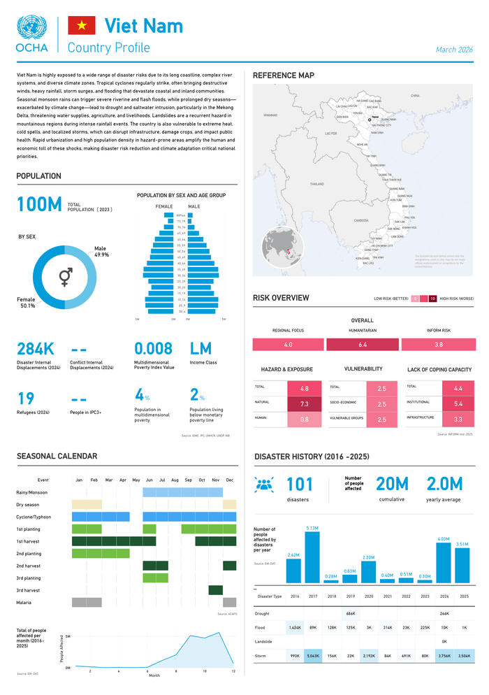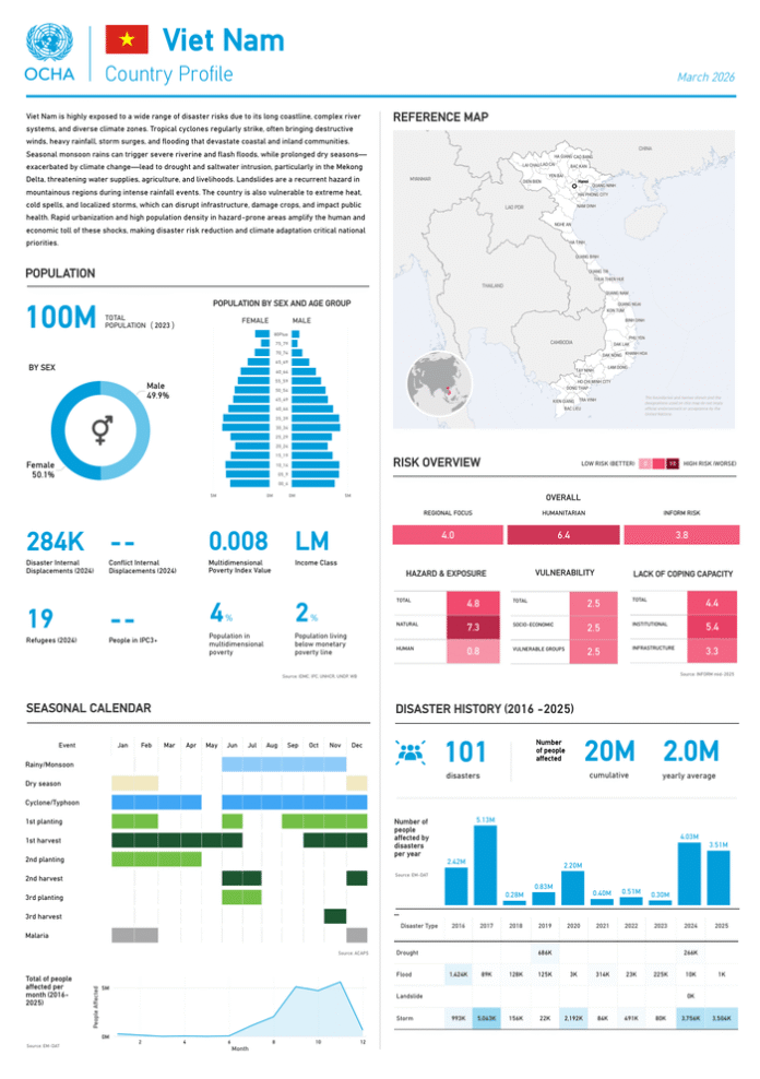 Country: Viet Nam Source: UN Office for the Coordination of Humanitarian Affairs Please refer to the attached file. Viet Nam is highly exposed to a wide range of disaster risks due to its long coastline, complex river systems, and diverse climate zones. Tropical cyclones regularly strike, often bringing destructive winds, heavy rainfall, storm surges, and flooding that devastate coastal and inland communities. Seasonal monsoon rains can trigger severe riverine and flash floods, while prolonged dry seasons – exacerbated by climate change – lead to drought and saltwater intrusion, particularly in the Mekong Delta, threatening water supplies, agriculture, and livelihoods. Landslides are a recurrent hazard in mountainous regions during intense rainfall events. The country is also vulnerable to extreme heat, cold spells, and localized storms, which can disrupt infrastructure, damage crops, and impact public health. Rapid urbanization and high population density in hazard-prone areas amplify the human and economic toll of these shocks, making disaster risk reduction and climate adaptation critical national priorities.