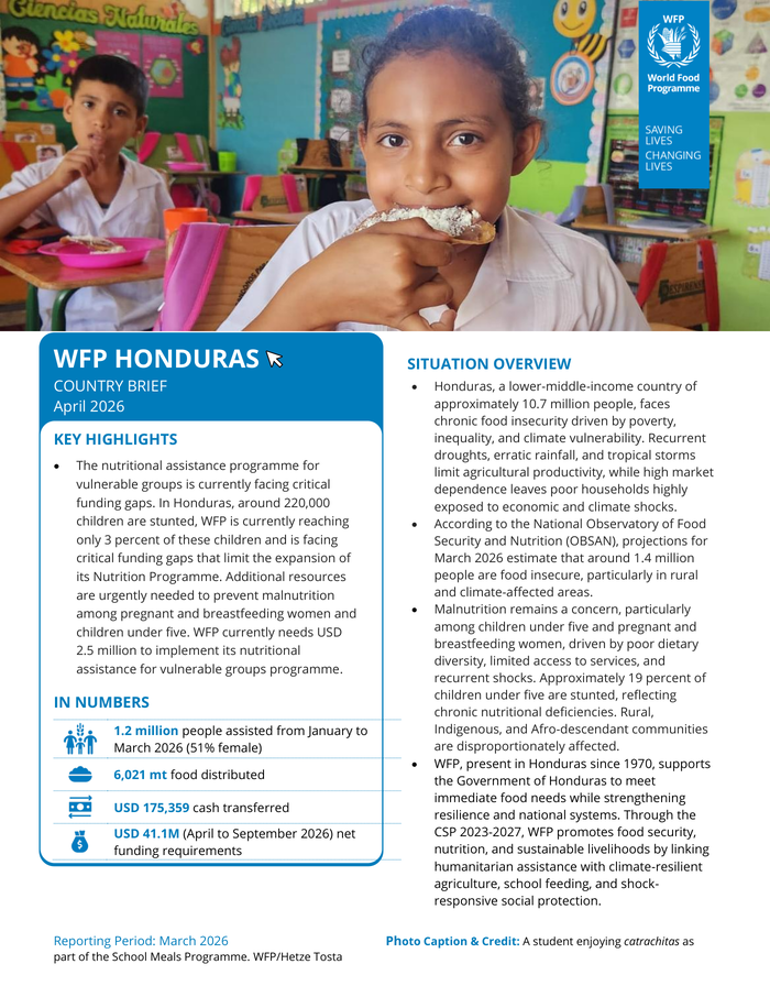 HomePoliticsWFP Honduras April Country Brief Politics WFP Honduras April Country Brief By muhammadhasan0426@gmail.com April 16, 2026 0 2 Share FacebookTwitterPinterestWhatsApp Country: Honduras Source: World Food Programme Please refer to the attached file. Read full story on Reliefweb Share FacebookTwitterPinterestWhatsApp Previous articlePakistan ramps up furnace oil use, delays nuclear maintenance amid LNG shortagesNext articleHyderabad Kingsmen extend winning streak with five-wicket win over RawalPindiz RELATED ARTICLES Politics Pakistan is actively contributing to a regional equilibrium that serves the interests of all engaged parties April 18, 2026 Politics Weaponizing Women in Balochistan April 18, 2026 Politics UAE condemns attack on UNIFIL troops in southern Lebanon April 18, 2026 LEAVE A REPLY Cancel reply Comment: Please enter your comment! Name:* Please enter your name here Email:* You have entered an incorrect email address! Please enter your email address here Website: Save my name, email, and website in this browser for the next time I comment. - Advertisment - Most Popular Taylor Swift, Travis Kelce’s wedding: Everything to know about venue, guest list, dress, more April 18, 2026 Brenda Song, Macaulay Culkin’s ‘two-week rule’ for their sons revealed April 18, 2026 Louis Tomlinson cuts ties with Zayn Malik online April 18, 2026 Lena Dunham discusses how young love with Jack Antonoff shaped perspective April 18, 2026 Load more Recent Comments