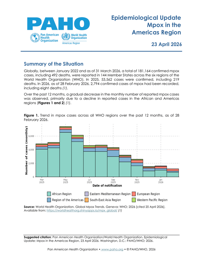 Country: World Source: Pan American Health Organization Please refer to the attached file. Globally, between January 2022 and as of 31 March 2026, a total of 181, 164 confirmed mpox cases, including 492 deaths, were reported in 144 Member States across the six regions of the World Health Organization (WHO). In 2025, 53, 562 cases were confirmed, including 219 deaths. In 2026, as of 28 February 2026, 2, 794 confirmed cases of mpox had been recorded, including eight deaths. Over the past 12 months, a gradual decrease in the monthly number of reported mpox cases was observed, primarily due to a decline in reported cases in the African and Americas regions. Mpox continues to spread globally, driven by the circulation of various virus clades (Ia, Ib, IIa, and IIb), each with distinct epidemiological characteristics. Clade IIb has been primarily responsible for global expansion since 2022.