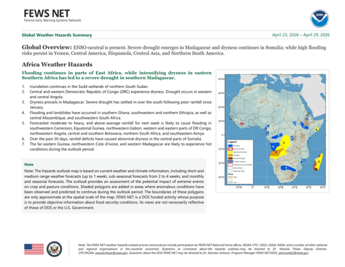 Country: World Source: Famine Early Warning System Network Please refer to the attached file. Global Overview: ENSO-neutral is present. Severe drought emerges in Madagascar and dryness continues in Somalia; while high flooding risks persist in Yemen, Central America, Hispaniola, Central Asia, and Northern South America. Africa Weather Hazards Flooding continues in parts of East Africa, while intensifying dryness in eastern Southern Africa has led to a severe drought in southern Madagascar. 1. Inundation continues in the Sudd wetlands of northern South Sudan. 2. Central and western Democratic Republic of Congo (DRC) experience dryness. Drought occurs in western and central Angola. 3. Dryness prevails in Madagascar. Severe drought has settled in over the south following poor rainfall since January. 4. Flooding and landslides have occurred in southern Ghana, southwestern and northern Ethiopia, as well as central Mozambique, and southwestern South Africa. 5. Forecasted moderate to heavy, and above-average rainfall for next week is likely to cause flooding in southwestern Cameroon, Equatorial Guinea, northwestern Gabon, western and eastern parts of DR Congo, northwestern Angola, central and southern Botswana, northern South Africa, and southeastern Kenya. 6. Over the past 30 days, rainfall deficits have caused abnormal dryness in the central parts of Somalia. 7. The far-eastern Guinea, northwestern Cote d’Ivoire, and western Madagascar are likely to experience hot conditions during the outlook period.