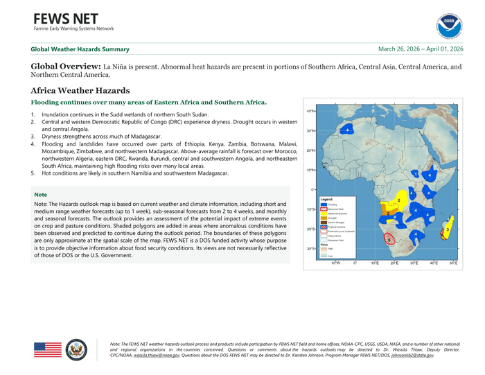 Country: World Source: Famine Early Warning System Network Please refer to the attached file. Global Overview: La Niña is present. Abnormal heat hazards are present in portions of Southern Africa, Central Asia, Central America, and Northern Central America. Africa Weather Hazards Flooding continues over many areas of Eastern Africa and Southern Africa. 1. Inundation continues in the Sudd wetlands of northern South Sudan. 2. Central and western Democratic Republic of Congo (DRC) experience dryness. Drought occurs in western and central Angola. 3. Dryness strengthens across much of Madagascar. 4. Flooding and landslides have occurred over parts of Ethiopia, Kenya, Zambia, Botswana, Malawi, Mozambique, Zimbabwe, and northwestern Madagascar. Above-average rainfall is forecast over Morocco, northwestern Algeria, eastern DRC, Rwanda, Burundi, central and southwestern Angola, and northeastern South Africa, maintaining high flooding risks over many local areas. 5. Hot conditions are likely in southern Namibia and southwestern Madagascar.