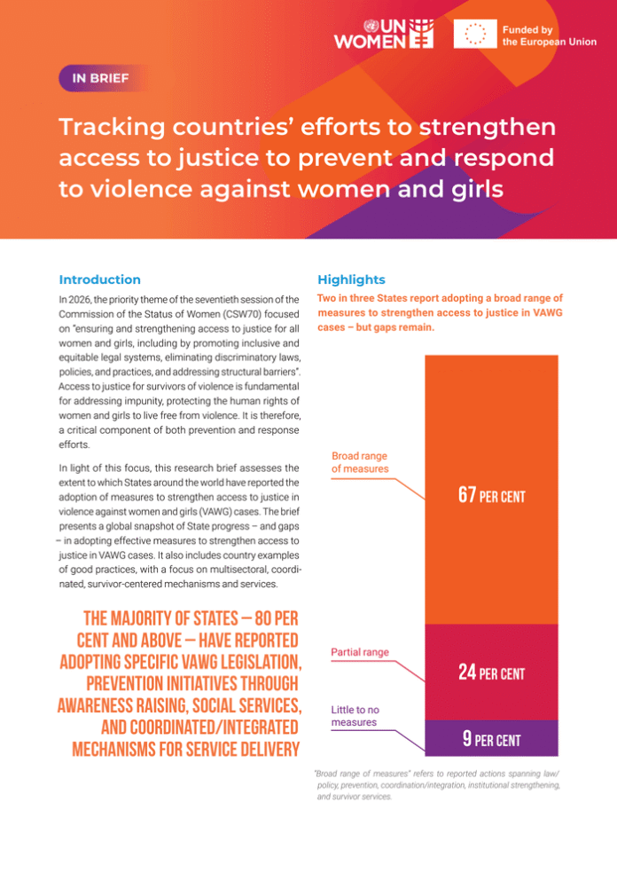 Country: World Source: UN Women Please refer to the attached file. The 2026 priority theme of the Commission on the Status of Women focused on strengthening access to justice for all women and girls. Access to justice is essential not only for holding perpetrators accountable but also for ensuring that survivors can obtain protection, support, and remedies. This research brief examines what Member States have reported doing to strengthen access to justice to prevent and respond to violence against women and girls. Drawing on UN Women’s Global Database on Violence against Women and Girls, it provides a global snapshot of progress and remaining gaps across legislation, prevention, coordination, institutional strengthening, and survivor services. It highlights that two in three Member States report a broad range of measures, while one in three still report only partial or little action. The brief also points to persistent gaps in referral pathways, one-stop centres, legal aid, psychosocial support, and training for police and justice actors. By combining global data with selected country examples, the brief helps show where progress is being made and where implementation still falls short. It underlines that adopting a measure is only a first step: justice depends on whether laws, services, and systems are accessible, survivor-centred, well-coordinated, and effectively resourced and implemented. In doing so, the brief helps frame access to justice as a practical and urgent priority in efforts to end violence against women and girls.