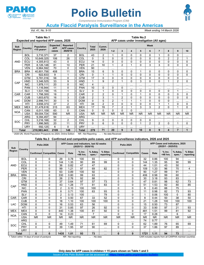 HomeHealthWorld: Polio Bulletin: Acute Flaccid Paralysis Surveillance in the Americas Vol. 41,... Health World: Polio Bulletin: Acute Flaccid Paralysis Surveillance in the Americas Vol. 41, No. 9-10 (Week ending 14 March 2026) By muhammadhasan0426@gmail.com March 25, 2026 0 1 Share FacebookTwitterPinterestWhatsApp Country: World Source: Pan American Health Organization Please refer to the attached file. Read full story on Reliefweb Share FacebookTwitterPinterestWhatsApp Previous articleWorld: Global Weather Hazards Summary March 26, 2026 – April 1, 2026Next articleخطے کی کشیدہ صورتحال کے باعث وفاقی ترقیاتی بجٹ میں بڑے پیمانے پر کٹوتیاں،تفصیلات روزنامہ اوصاف نے حاصل کر لیں RELATED ARTICLES Health Alan Piket Advocates For Mental Health Awareness And Sustainable Creativity In Modern Comedy March 25, 2026 Health Minister reaffirms govt’s strong commitment to ensure uninterrupted availability of fertilisers March 25, 2026 Health Healthcare upgrade underway at DHQ Hospital March 25, 2026 LEAVE A REPLY Cancel reply Comment: Please enter your comment! Name:* Please enter your name here Email:* You have entered an incorrect email address! Please enter your email address here Website: Save my name, email, and website in this browser for the next time I comment. - Advertisment - Most Popular Saudi Arabia reaffirms support for maritime safety, seafarer protection March 25, 2026 Pakistan’s historic achievements March 25, 2026 Saudi Arabia welcomes UNHRC adoption of resolution on human rights implications of Iranian attacks on region March 25, 2026 Abdullah bin Zayed condemns terror plot in Kuwait; affirms UAE’s full solidarity March 25, 2026 Load more Recent Comments